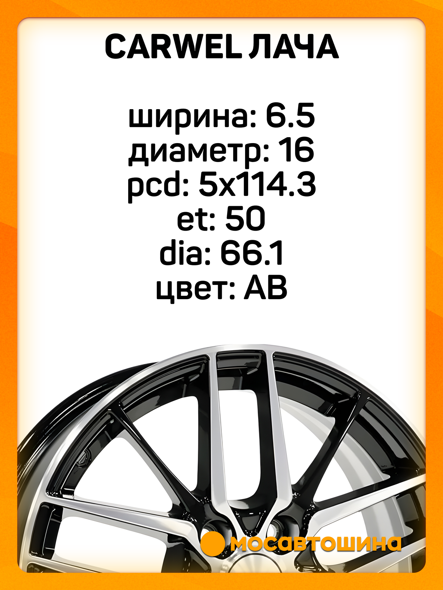 Диск CARWEL Лача диаметр обода 16, ширина обода 6.5, количество крепежных отверстий 5, диаметр расположения отверстий 114.3, диаметр центрального отверстия 66.1, вылет (ET) 50, цвет AB