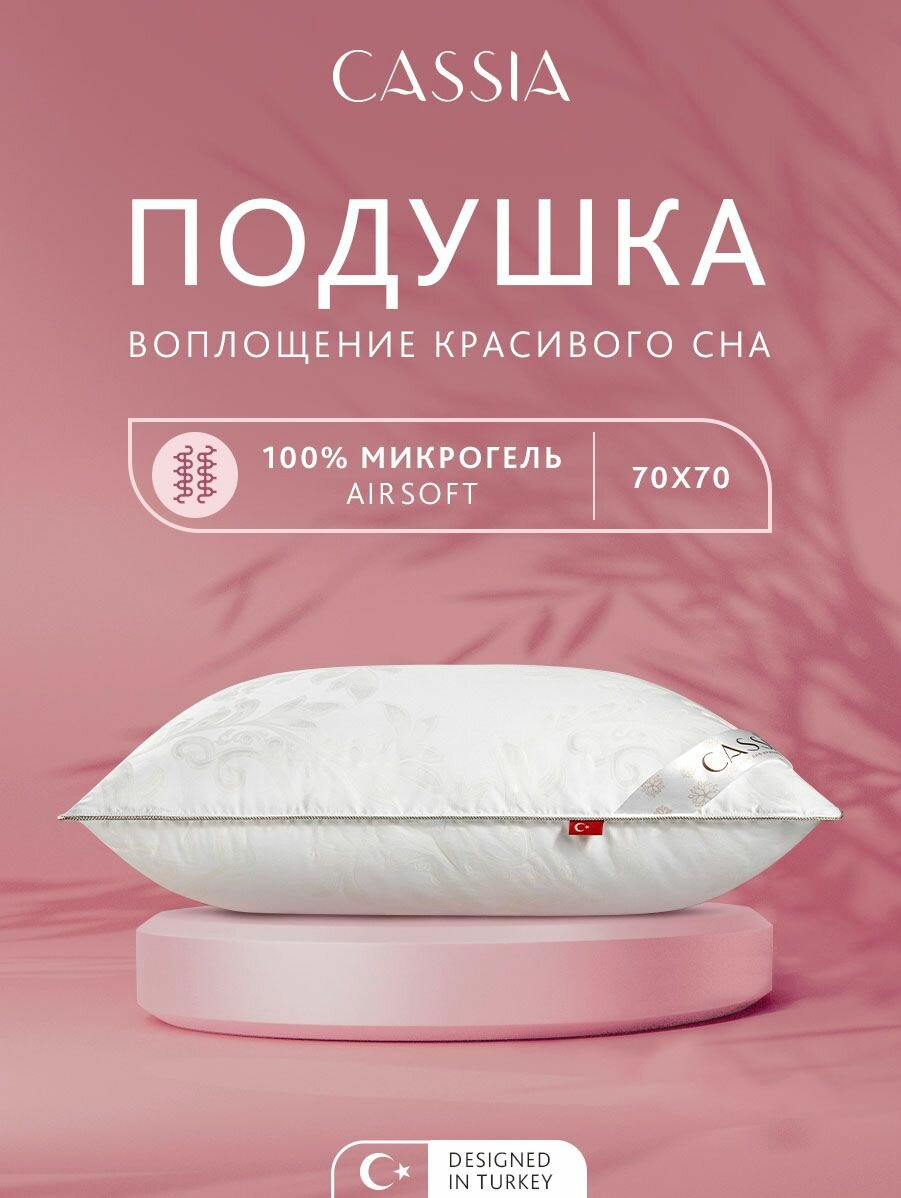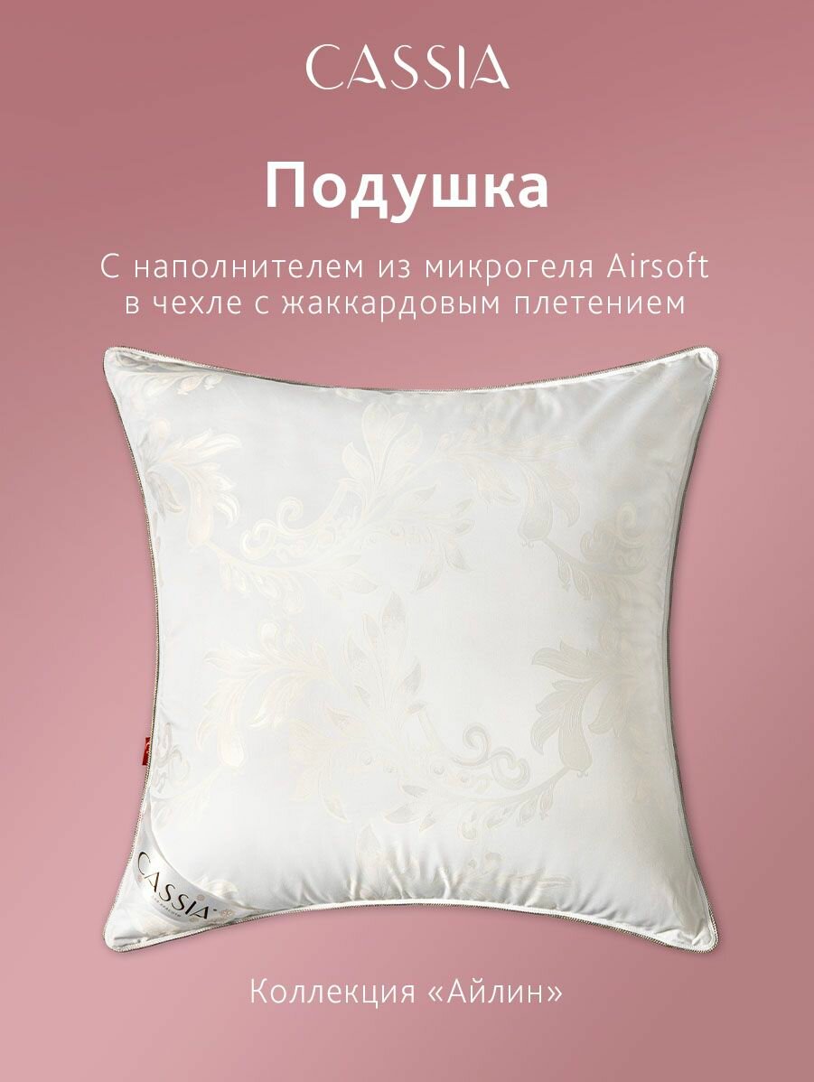 Подушка «Айлин» 70х70 см бренда CASSIA имеет чехол из 50% хлопка, 50% вискозного шелка; жаккардовое плетение с классическим орнаментом; наполнитель из 100% микрогеля Airsoft.