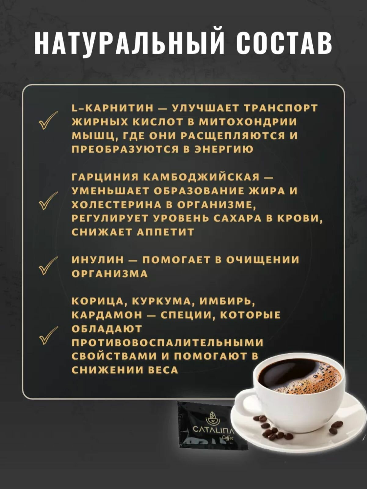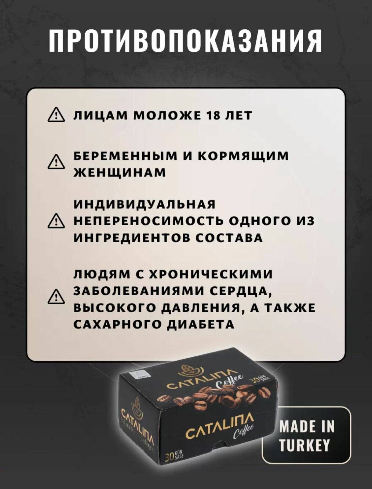 Турецкий кофе для похудения Catalina Coffee оригинал — это уникальный продукт на натуральной основе премиум класса, который позволит вам постройнеть благодаря его эффективному воздействию на организм. В его создании принимали участие ведущие диетологи и нутрициологи из нескольких стран. Данный товар подойдёт для тех, у кого проблемы с лишним весом, повышенное ожирение, сложности самостоятельно сбросить вес, болезни связанные с большой массой тела, когда нет времени на спорт, непереносимость голода. Комбинированный препарат, который не только имеет эффект жиросжигания, но и способствует наращиванию мышечных структур-лучший помощник, когда нужно как можно скорее привести себя в порядок, похудеть срочно без диеты, не посещая фитнес зал. Как жиросжигатель, он содержит Л-карнитин, который поможет снизить процент жира и ускорит процесс обмена веществ. Он устраняет чувство голода, подавляет аппетит, снижает тягу к сладкому, выводит жидкость, убирает отечность-особенно хорошо снимает отек в области лица: контуры становятся более четкими и выраженными, устраняется второй подбородок. Активная формула перерабатывает жиры в энергию, поэтому средство идеально подходит для спортсменов и подвижных людей. В нем также присутствуют компоненты, такие как коллаген и гиалуроновая кислота, которые поддерживают здоровую кожу и улучшают пищеварение. Благодаря приятному и мягкому вкусу, потрясающему аромату этот напиток для тех, кто любит пить кофе, но хочет избавиться от жировых отложений, ведь это - одна из самых актуальных проблем, особенно для женщин. Ведь стройность это не только привлекательный внешний вид, это в первую очередь, хорошее самочувствие и долголетие. При подключении к курсу тренировок, утренней гимнастики или бега метаболизм разгоняется до 40% от базового. Это значит, что худеть вы будете в 2 раза быстрее. БАД с мощным жиросжигающим комплексом также интенсивно сжигает ненужное при условии правильного питания. Основное качество Каталина кофе в его особенном составе, направленном на плавное снижение веса без вреда для здоровья. Он обладает легким мочегонным действием, но при этом не вымывает кальций, калий и другие полезные элементы. Особая ценность в его положительном влиянии не только на фигуру, но и на красоту: природные составляющие помогают выработке коллагена и эластина, насыщают и питают его витаминами и минералами. Уходят отеки, повышается упругость и эластичность кожных покровов. Замечательный выбор для тех, кто не желает чай и протеиновые коктейли. Преимущества: удобство применения, терапевтические свойства компонентов и безопасность. Легкость усвоения, заряд бодрости с утра, приемлемая цена, также упаковка выглядит презентабельно и может служить отличным подарком! Способа применения: 1 стик пакетик на чашку. Не заваривать кофе крутым кипятком! Кофе сразу свернется! Заваривайте слегка горячей водой! Снижение аппетита и веса, похудение.