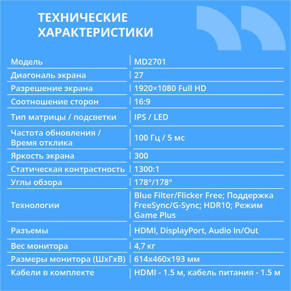 | Подробная комплектация | "Монитор - 1 шт.; HDMI кабель (1.5м) - 1 шт.; DP кабель (1.5м) - 1 шт.; Блок питания - 1 шт.; Кабель питания (2.2м) - 1 шт.; Инструкция - 1 шт.; " |