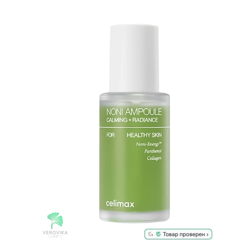 Сыворотка Celimax The Real Noni Energy Ampoule восстанавливает и укрепляет кожу, смягчает, выравнивает рельеф и уменьшает воспаление, снимает раздражение и зуд, укрепляет защитный барьер. Средство повышает эластичность и упругость, оказывает антивозрастной эффект за счёт мощного коктейля антиоксидантов. Некомедогенная формула не закупоривает поры и не провоцирует раздражение, подходит для кожи, склонной к воспалениям и акне. Лёгкая текстура не утяжеляет кожу, не оставляет липкости и быстро впитывается, не содержит искусственных красителей — зелёный цвет достигается за счёт экстракта нони. После впитывания на сыворотку отлично ложится макияж. Продукт имеет аромат розмарина. Главные действующие компоненты — экстракт и масло нони. Нони или моринда — тропический суперфуд, который насыщен витаминами, минералами и полифенолами. Нони питает, успокаивает и смягчает кожу, оказывает антиоксидантный эффект, замедляя возрастные изменения, а также блокирует воспалительный процесс. Дополнительные действующие компоненты: Коллаген интенсивно увлажняет, помогает клеткам сохранять влагу, улучшает текстуру кожи, стимулирует процессы восстановления, способствует разглаживанию морщин. Пантенол (витамин B5) снимает покраснение и зуд, укрепляет гидролипидный барьер, препятствует испарению влаги, способствует восстановлению. Аллантоин смягчает, ускоряет заживление, оказывает антиоксидантное действие, помогает снизить реактивность. Гиалуронат натрия увлажняет, поддерживает эластичность и гладкость рельефа. Аденозин — антивозрастной актив с доказанной эффективностью, стимулирует синтез коллагена, разглаживает и уплотняет кожу, уменьшает выраженность морщин и предотвращает их появление. Масла розмарина, оливы, макадамии, жожоба и виноградной косточки питают, устраняют сухость, разглаживают и смягчают. Подходит для нормальной, комбинированной, сухой и чувствительной кожи. Способ применения: после умывания и тонизирования нанесите сыворотку на лицо, распределите по коже. Объем: 50 мл Производство Южная Корея