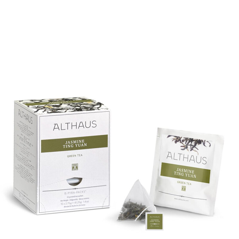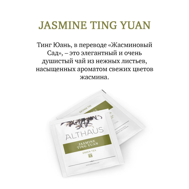 Ting Yuan, в переводе ? Жасминовый Сад, - это элегантный и очень душистый чай из нежных листьев, насыщенных ароматом свежих цветов жасмина. Состав: чай зеленый байховый листовой высшего сорта, цветы жасмина. Способ приготовления: заварить чайный пакетик в чашке и настоять 2-3 минуты. Количество пакетиков в упаковке: 15 штук. Тип упаковки: картонная. Страна производства: Германия.