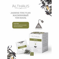 Вид чая: пакетированный. Тип чая: зеленый. Вкус: жасмин. Тип пакетика: пирамидка. Наличие индивидуального пакетика: Да. Чайных пакетиков в упаковке: 15 штук. вес брутто: . вес нетто товара: . Срок хранения от даты производства (месяцев): 36. Вес, г: 41. Тип упаковки: картонная. Страна происхождения: Россия.