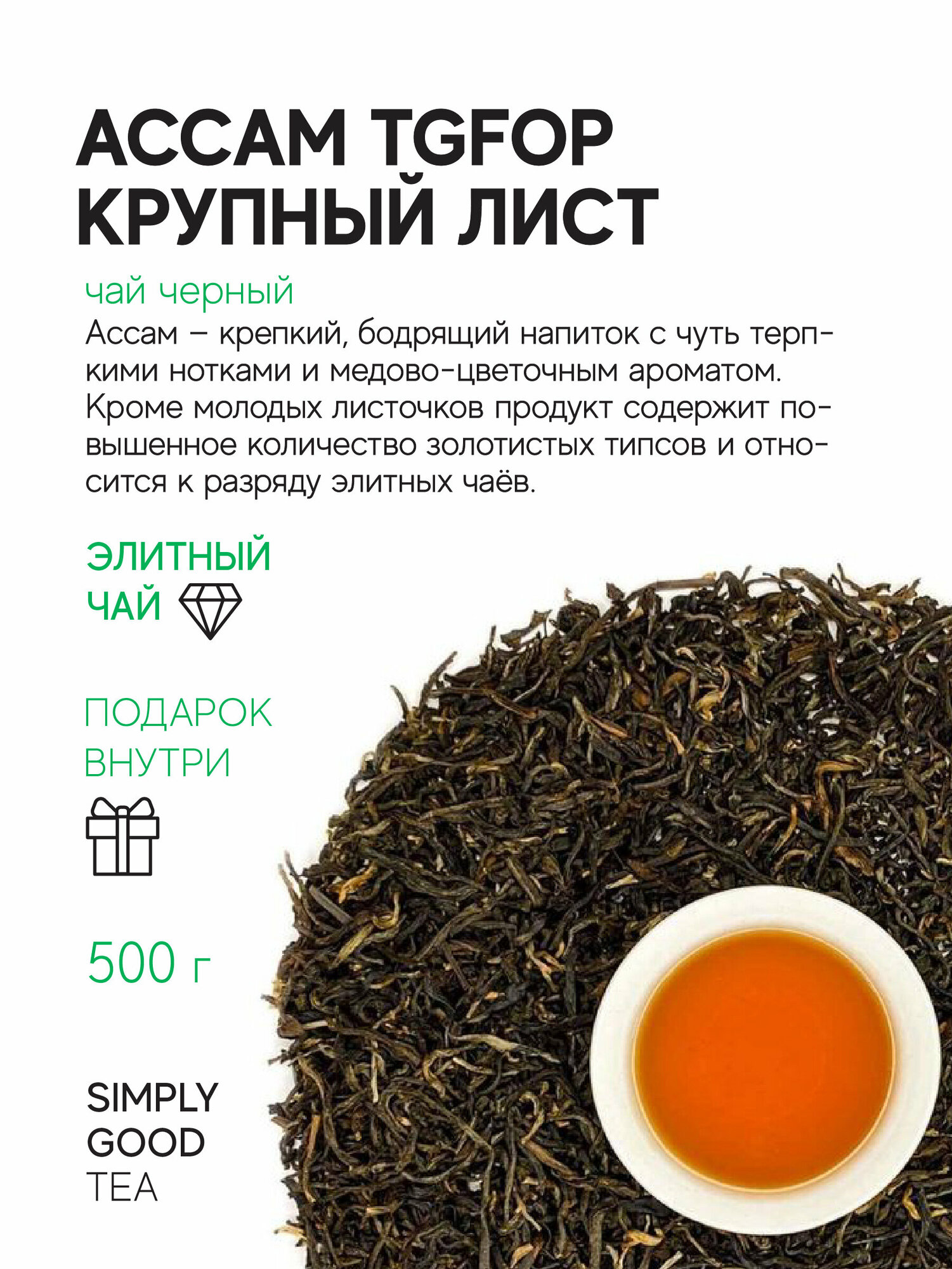 Индийский чай Aссам TGFOP 500 г – крупнолистовой, классический, чёрный чай, вкус и качество которого ценятся во всём мире. TGFOP в маркировке напитка расшифровывается как Tippy Golden Flowery Orange Pekoe. Это означает, что кроме молодых листочков продукт содержит повышенное количество золотистых типс и относится к разряду элитных чаёв.