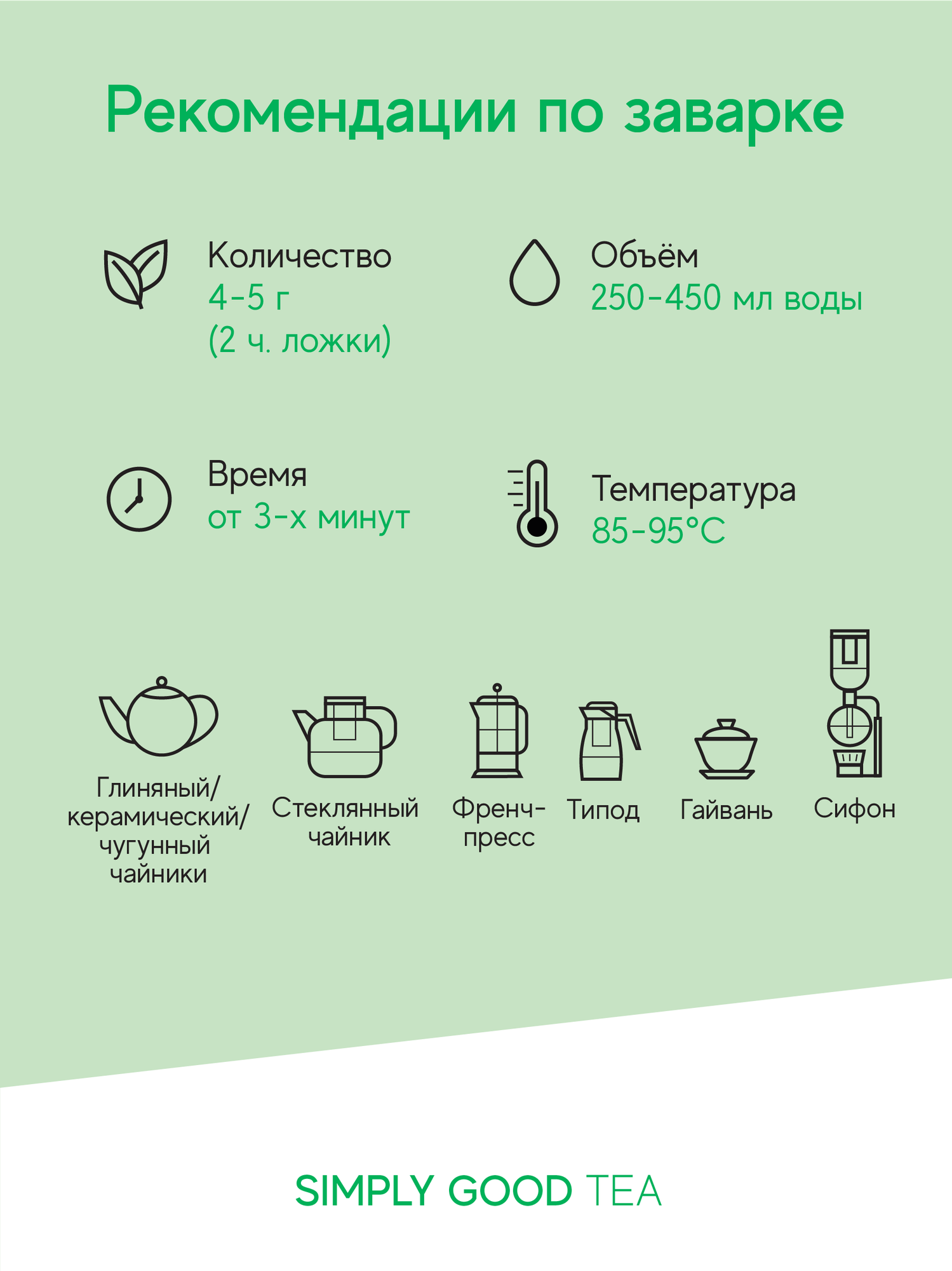Способы приготовления. Чай прост в приготовлении: 1 г на 100 мл или 2 ч. л. = 4-5 г на 250-450 мл. Настаивать от 3 минут в воде 85-95 °C. Не стоит заваривать чай кипятком 100 °C, вы разрушаете ароматические соединения!