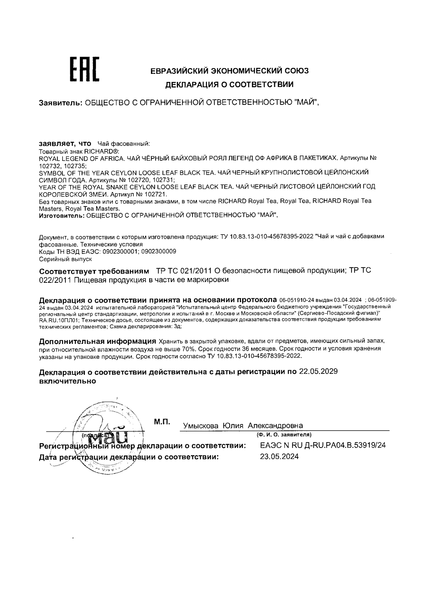 Чай черный байховый Royal Legend of Africa, 100пакетиков 4шт