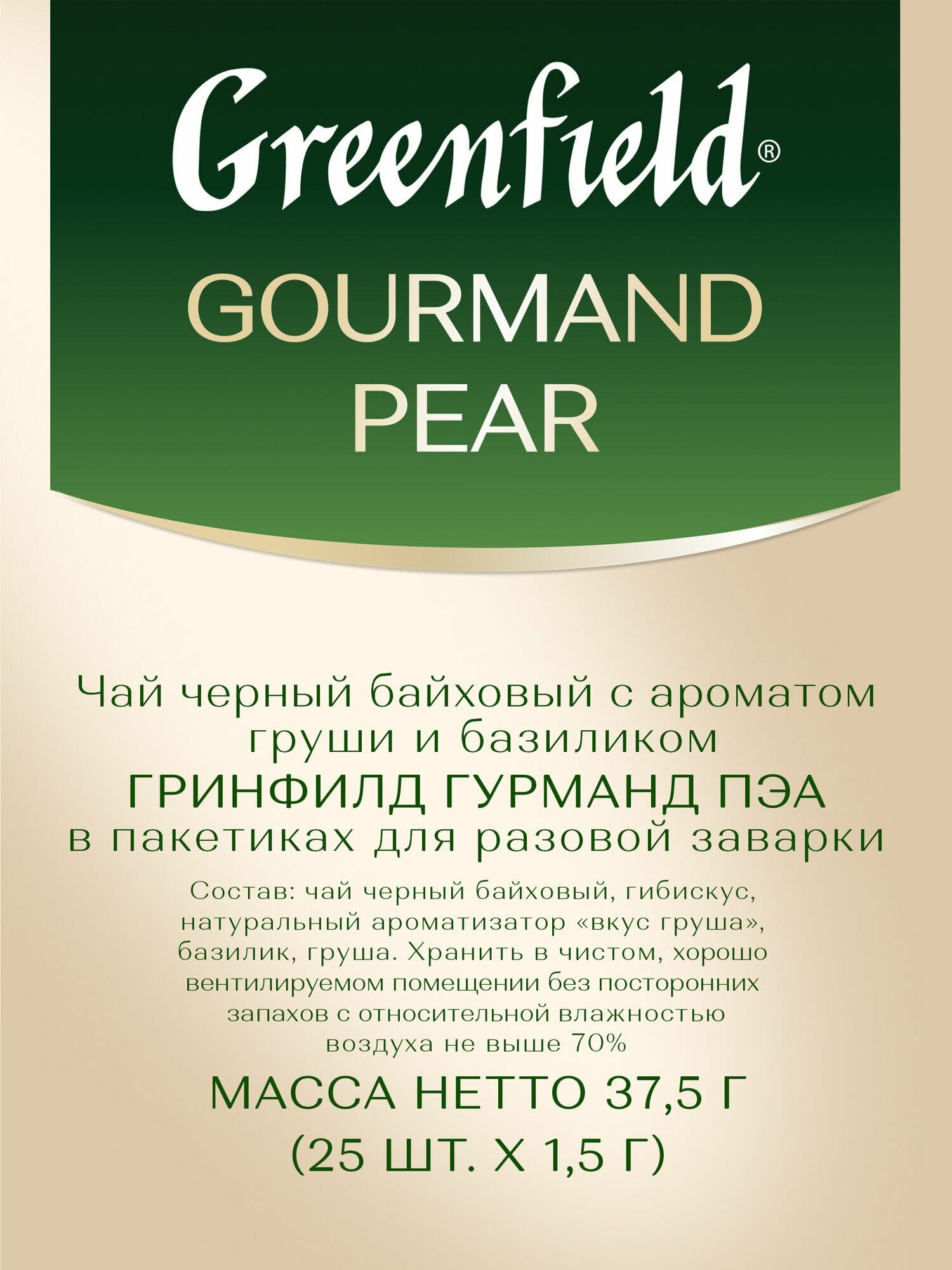 Купить Чай черный Greenfield Gourmand Pear, 10шт по 25пакетиков. Груша и базилик с доставкой по всей России. Чай черный Greenfield Gourmand Pear, 10шт по 25пакетиков. Груша и базилик: сравнение цен, характеристики, фото, актуальное наличие и цены.