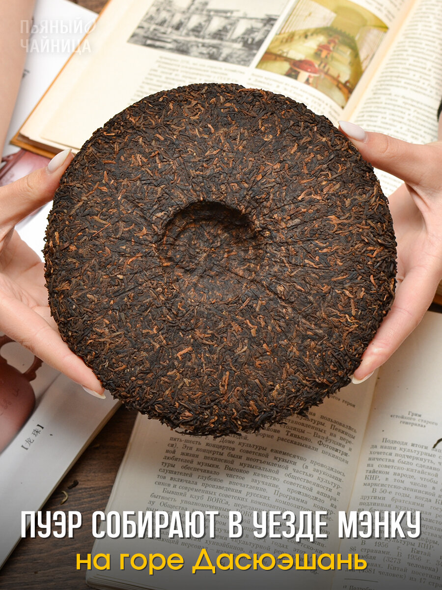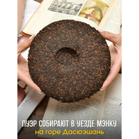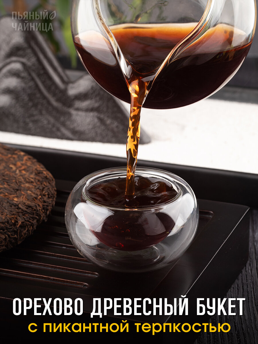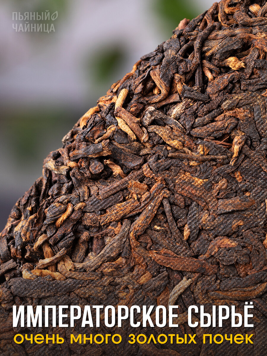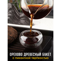 Важно понимать, что это представитель Шу пуэра. Кратко расскажем основную разницу между Шу и Шен пуэрами. Начальные этапы производства зелёного Шен и черного Шу пуэра схожи. Чайное сырье проходят одинаковые этапы: сбор, подвяливание, скрутка-сминание, прожарка. Далее Шен пуэр поступают на формовку и прессовку. Чай готов! При дальнейшем хранение чай ферментируется естественным образом, просто старея с течением времени. Шен пуэр приобретает глубокий букет, насыщаясь растительными и сухофруктовыми нотами.