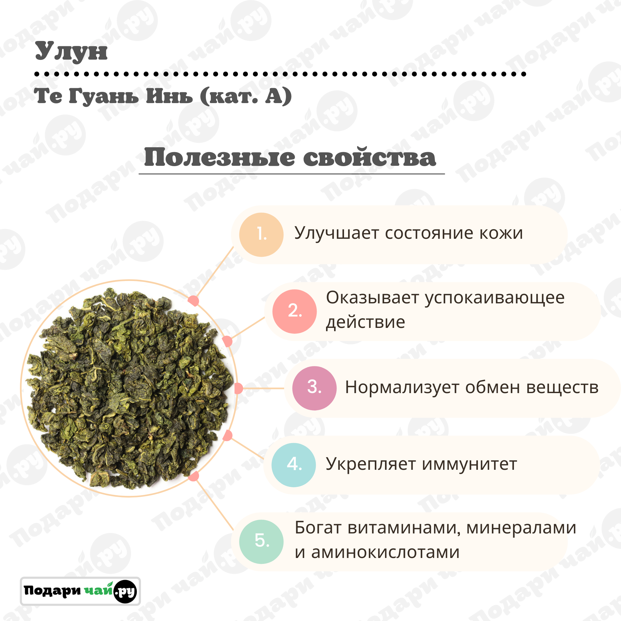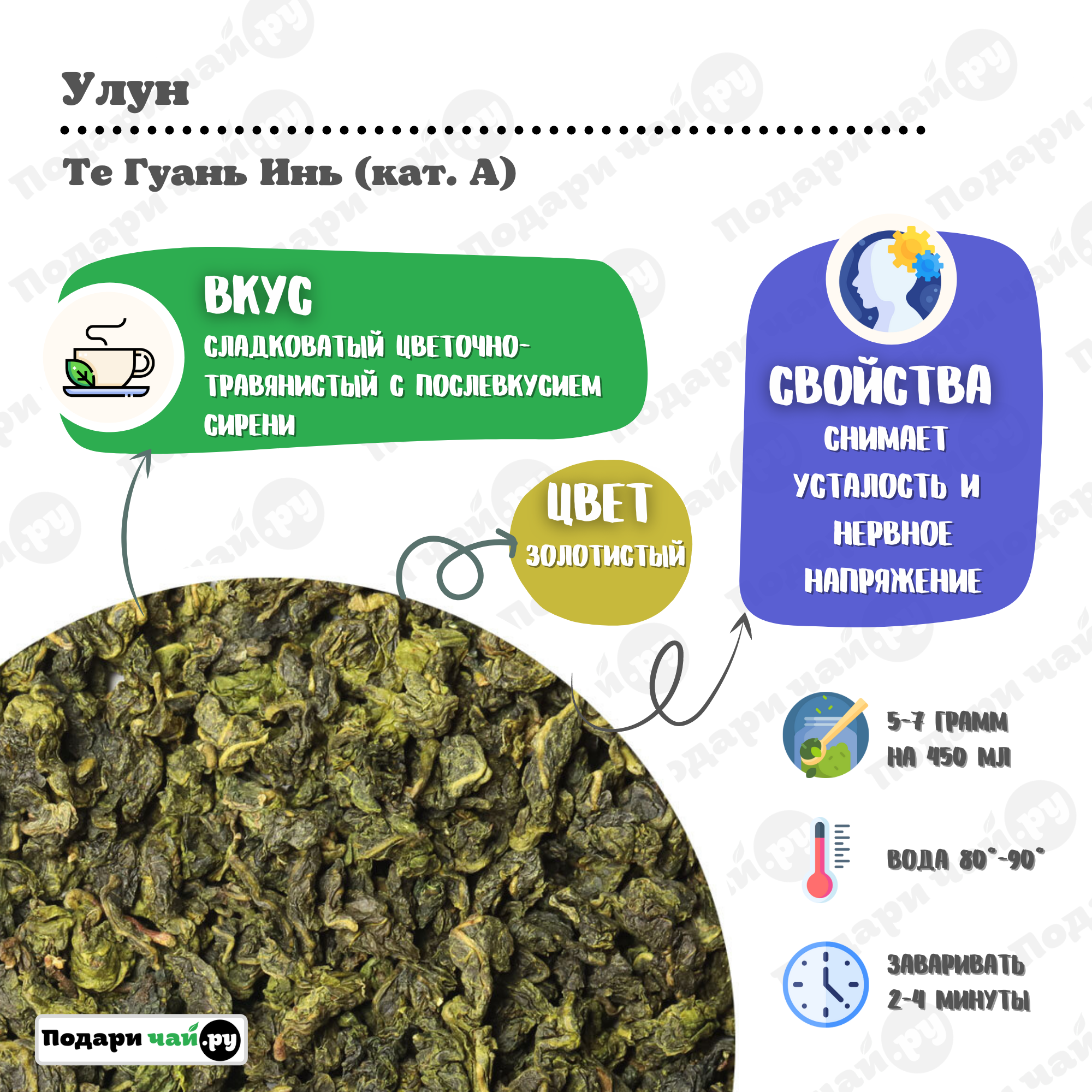 Аромат чая категории "А", обладает цветочными нотками орхидеи с оттенками ореха. Послевкусие сладкое, долгое. Улуны сочетают в себе яркий вкус и аромат черного чая и целебные свойства зеленого. Достигается это сложной технологией прерванной ферментации. Листья скатывают в шарики, верхняя часть окисляется и становится темной, а внутренняя остается зеленой и свежей, сохраняя все полезные свойства. Улун те гуань инь выращивают с VII века только в одной горной провинции Китая – Фуцзяни, в уезде Аньси. Для его создания берут с побегов четыре верхних полностью вызревших листа, накопивших максимальное количество витаминов, минералов и антиоксидантов. Медово-орхидейный манящий аромат, сладковатый цветочно-травянистый вкус с длительным необыкновенным послевкусием сирени вносит гармонию в душу. Этот улун иногда называют тигуанинь или гуаньинь – напиток Богини милосердия и спасения Гуань Инь.