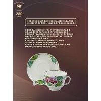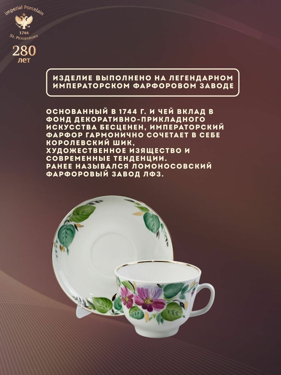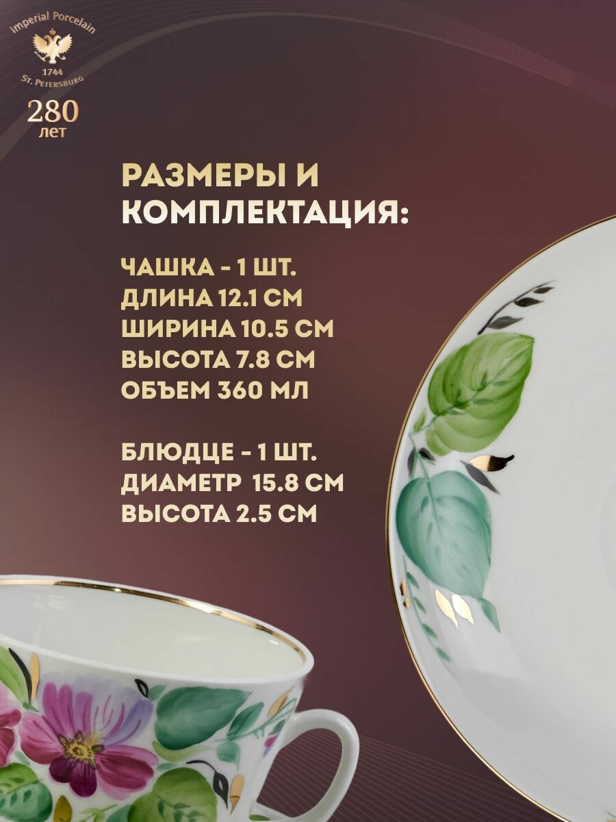 Чашка с блюдцем изготовлена на Императорском фарфоровом заводе из твердого фарфора. Для декорирования используется ручная надглазурная роспись. Автор рисунка - Нурия Каюмова, автор формы - Серафима Яковлева. Авторская модель создана в 1990 году. Объем чашки - 375 мл, высота - 7.8 см. Мы рекомендуем мыть это изделие вручную, чтобы как можно дольше сохранить его первоначальный вид. О форме Форма чашки "Подарочная" (авторское название "Большая подарочная") создана в 1970 году Серафимой Яковлевой по мотивам модели ИФЗ конца 19 века. Автор рисунка Каюмова Нурия Саматовна (род. 1931 г.) - с 1947 года живописец, художник на ЛФЗ, выполняла копии работ А. В. Воробьевского, И. И. Ризнича, М. Н. Моха, Л. И. Лебединской и других художников, стала выполнять ответственные заказы по собственным композициям, любила рисовать цветы. В 1994 г. королеве Великобритании Елизавете во время визита в Санкт-Петербург была подарена ваза с цветочной росписью, выполненной Н. С. Каюмовой. В 1993-1995 гг. обучала технике росписи по фарфору принцессу Италии Ирину Строцци. Автор формы Яковлева Серафима Евгеньевна (1910-1993 г. г.) - скульптор, заслуженный художник РСФСР. В 1935-1987 гг. работала на ЛФЗ, где ею было создано около 40 форм сервизов и около 50 форм различных других предметов. Разработанная в 1936 году форма "Тюльпан", получившая наибольшую известность в росписи "Кобальтовая сетка", стала на многие десятилетия одной из самых популярных. К другим популярным формам Серафимы Яковлевой относятся "Весенняя", "Банкетная" и др. В 1958 году на Всемирной художественно-промышленной выставке в Брюсселе была награждена Золотой медалью за формы сервизов "Восточный", "Весенний", "Тюльпан", в 1962 году - Серебряную медаль Международной выставки керамики в Праге. Работы находятся в коллекциях Эрмитажа, Русского музея и других музеях и частных собраниях.