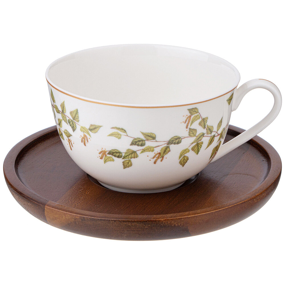 Чайная пара состоит из 2х предметов: чашка объёмом 290 мл и деревянная подставка из акации диаметром 15 см. Чашечка имеет диаметр верха 10 см и высоту 6 см. Аккуратные, тонкие веточки берез с изображением маленьких листочков и золотистых вкраплений сережек украшают поверхность кружки, создавая ощущение прикосновения к природе. Удобная ручка позволяет комфортно держать чашку в руке, а её фарфоровые стенки не дают напитку быстро остывать. Изумительный вариант изящной сервировки чаепития или кофейной паузы для себя или близкого Вам человека как дома, так и на работе.