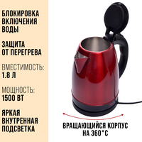 Чайник электрический ZM (х12). Материал: нержавеющая сталь 201, ПП. Цвет: красный, черный. Нагревательный элемент: скрытый. Объем: 1,8 л. Мощность: 1500 Вт. Напряжение: 220 В, 50 Гц. Индикатор включения: есть. Система защиты от кипячения без воды. Автоматическое отключение: есть. Вращение 360 градусов: есть. Отсек для хранения шнура: есть. Откидная крышка: есть. Размер упаковки: 18,3 х 18,3 х 23,2 см. Упаковка: коробка. Вес: 1,08 г. Страна производитель: Китай.