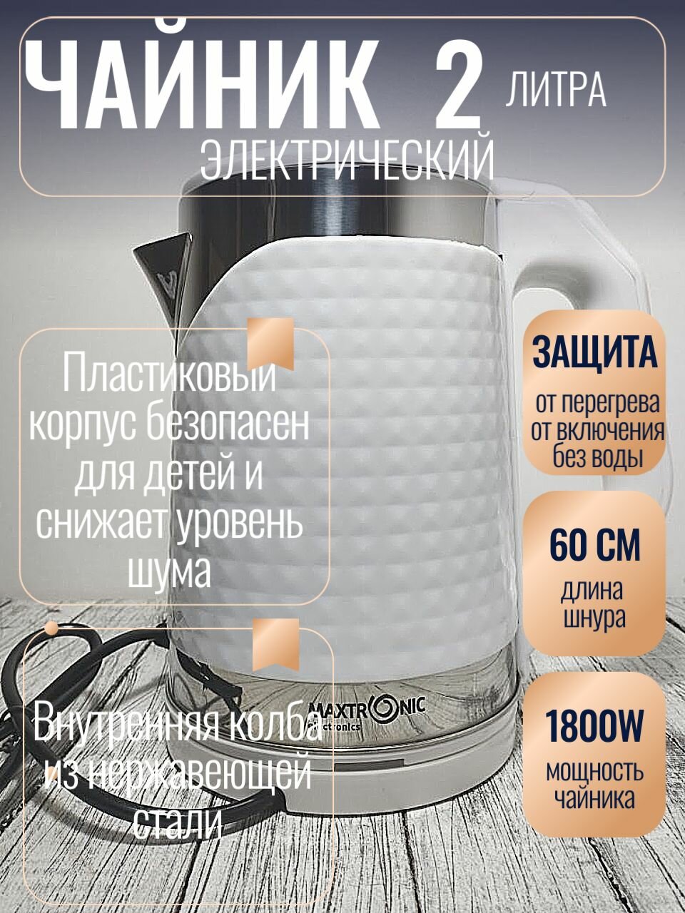 Чайник 2,0л нерж двойные стенки Maxtronic белый 1800Вт: сравнение цен, характеристики, фото, актуальное наличие и цены.