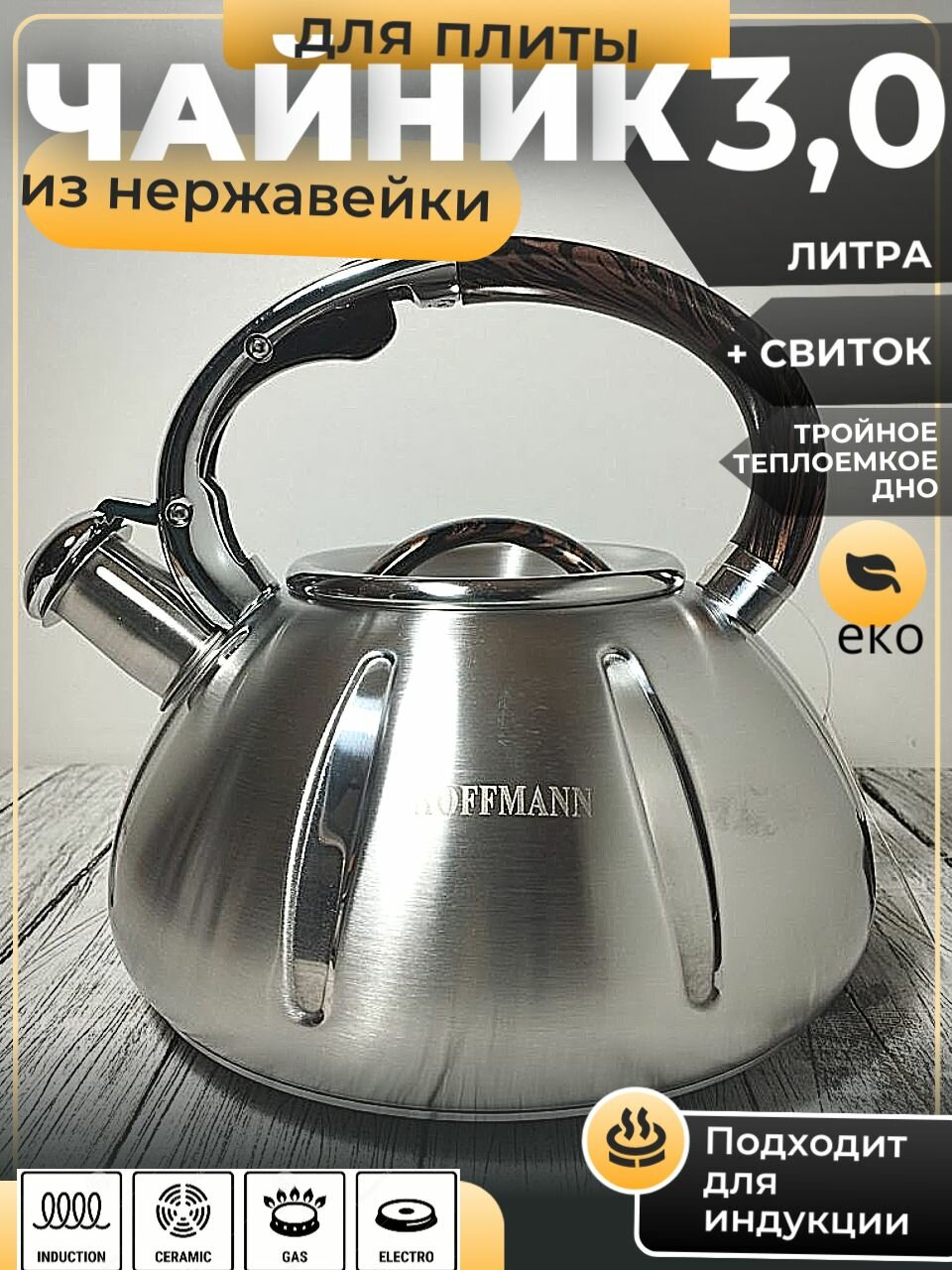 Купить Чайник 3,0л из нержавейки, матовый со свистком толстое дно HOFFMANN с доставкой по всей России. Чайник 3,0л из нержавейки, матовый со свистком толстое дно HOFFMANN: сравнение цен, характеристики, фото, актуальное наличие и цены.