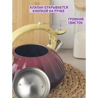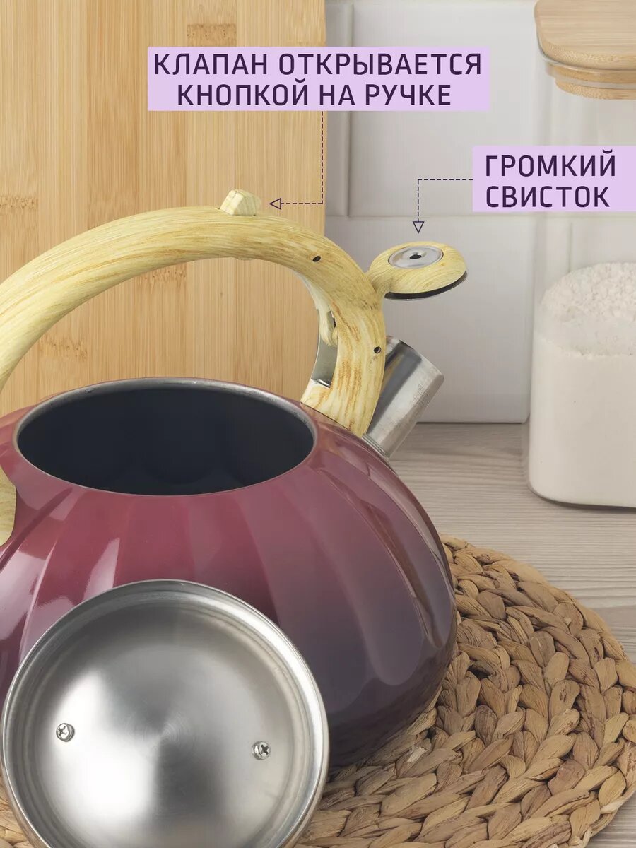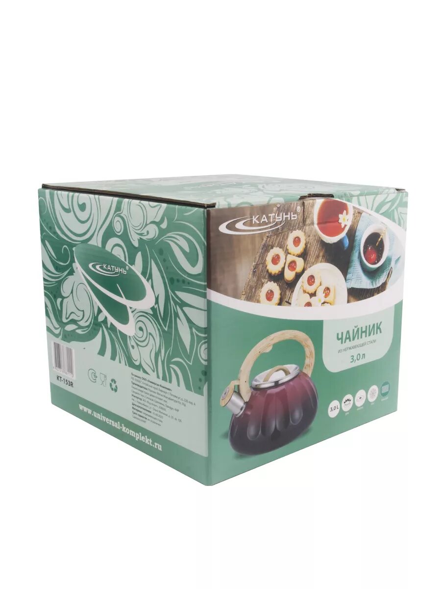 Чайник для плиты от ТМ Катунь выполнен из нержавеющей стали, которая отличается особой прочностью и долговечностью, она не окисляется и не впитывает запахи, благодаря чему Вы всегда получите натуральный, насыщенный вкус и аромат напитков. Капсульное дно и утолщенные стенки чайника обеспечивают высокую теплопроводность, равномерное распределение тепла, экономию энергозатрат, а также устойчивость изделия к деформации. Фиксированная эргономичная ручка с дизайном под дерево имеет антискользящее покрытие «soft-touch», которое обеспечивает комфортное использование чайника. На ручке предусмотрена кнопка с надежным механизмом для удобного открывания и фиксации свистка в поднятом состоянии при разливании кипятка по чашкам. Герметично закрывающаяся крышка защищает от ожогов паром и способствует быстрому нагреву воды. Носик чайника оснащен насадкой-свистком, который не только добавляет стильный акцент, но и позволяет контролировать процесс кипячения или подогрева воды. Элегантный и функциональный чайник современного дизайна станет прекрасным дополнением к Вашей кухне. Данная модель подходит для всех видов плит, в том числе индукционных. Объем чайника 3 л. Диаметр дна 17 см. Упакован в цветную подарочную коробку.