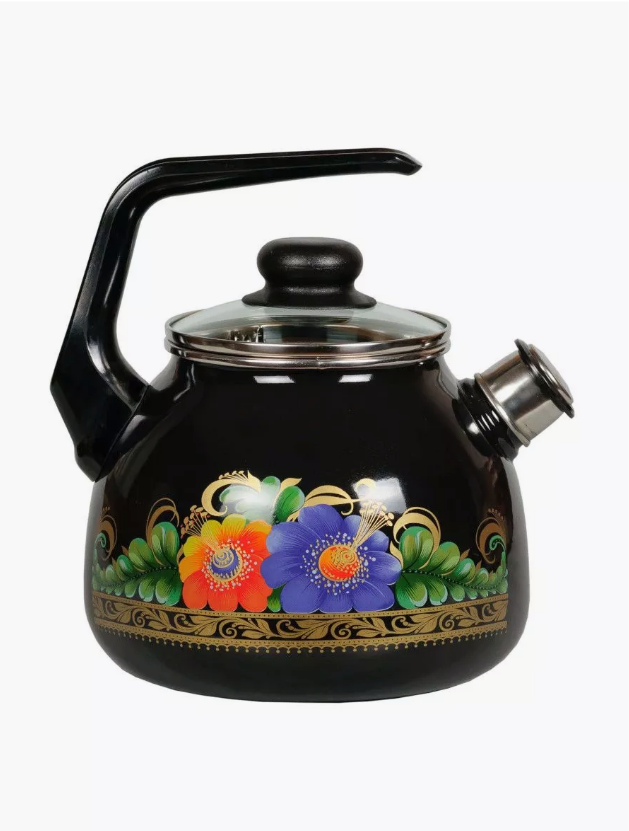 Чайник имеет стеклянную крышку с нержавеющим ободком и удобную бакелитовую ручку. Носик чайника оснащен свистком с полиамидным кольцом. Подходит для всех видов плит, в том числе и индукционных.