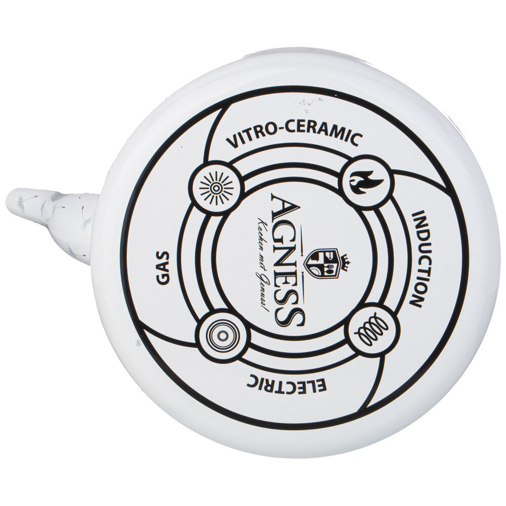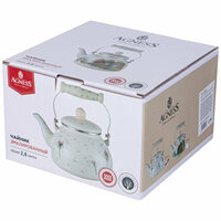 Чайник для плиты выполнен из наиболее гигиеничного материала - эмалированной стали. Его объём составляет 2600 мл, дно диаметром 18 см, общая длина 25 см, высота с поднятой ручкой составляет 23 см. Металлический чайник оснащен эргономичной ручкой, выполненной из нержавеющей стали. Она имеет керамическую накладку для захвата, а также в конструкции предусмотрен стопор для фиксирования ручки с одной стороны. Крышка стального чайника имеет пластиковую ручку.