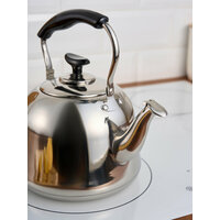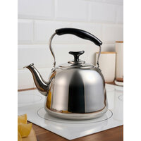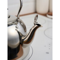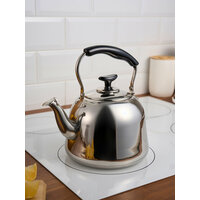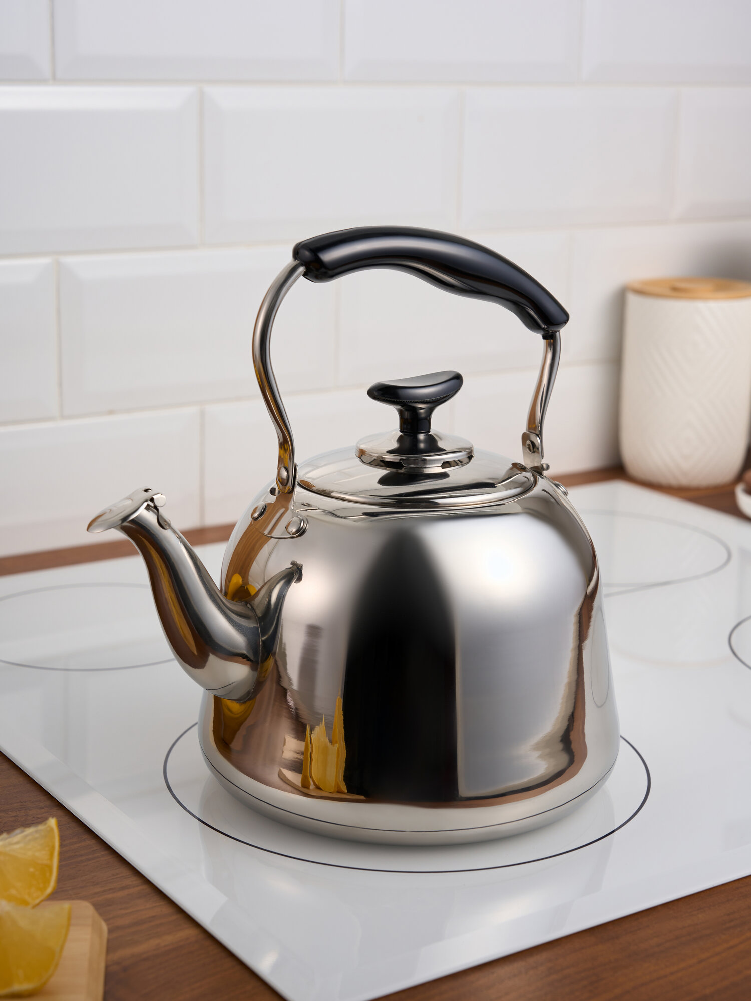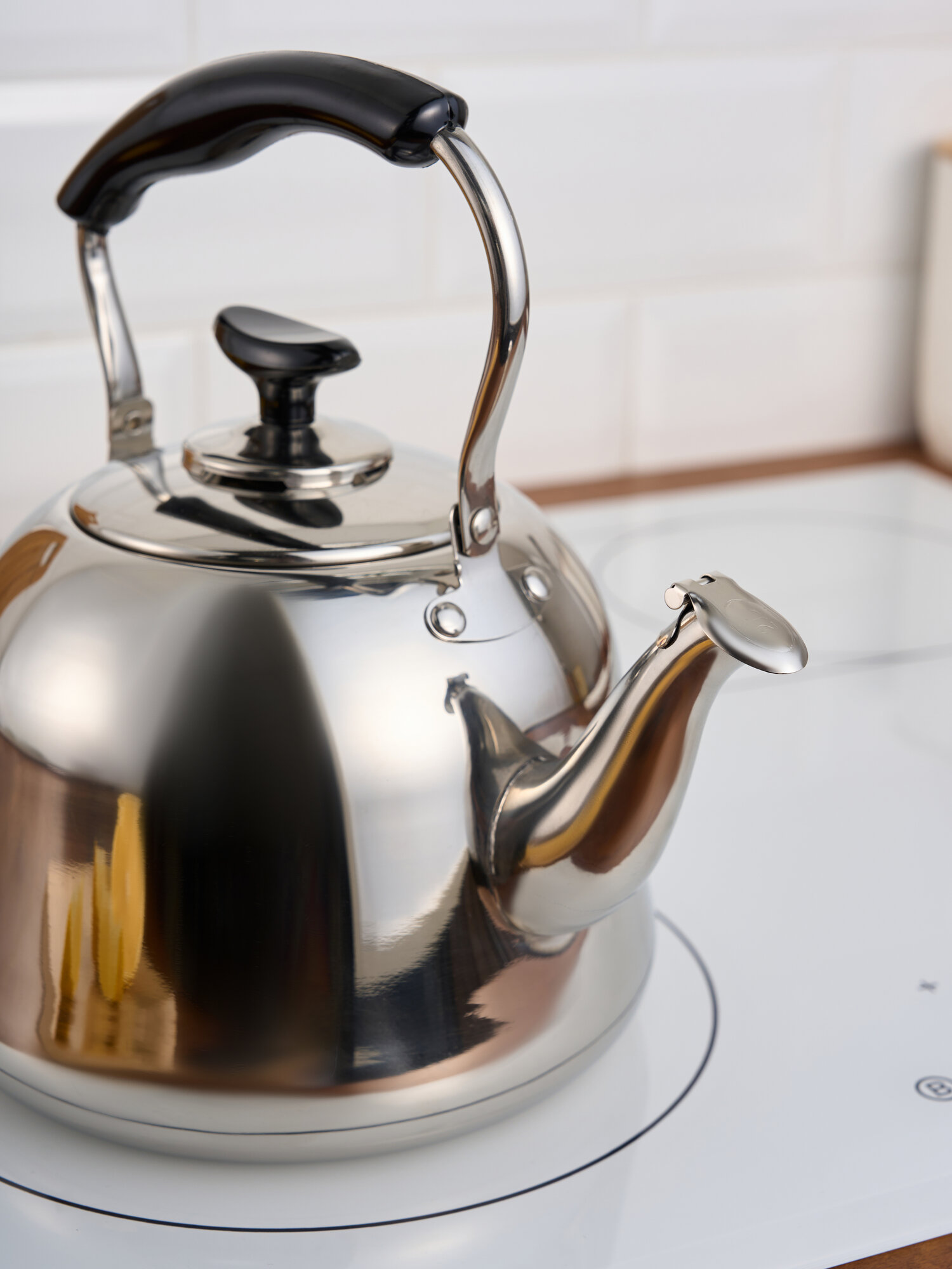 Поворотная ручка обеспечивает удобство использования, а пластиковая вставка позволяет легко переносить чайник. Встроенный свисток подскажет, когда вода закипит, и вам пора снимать чайник с плиты.