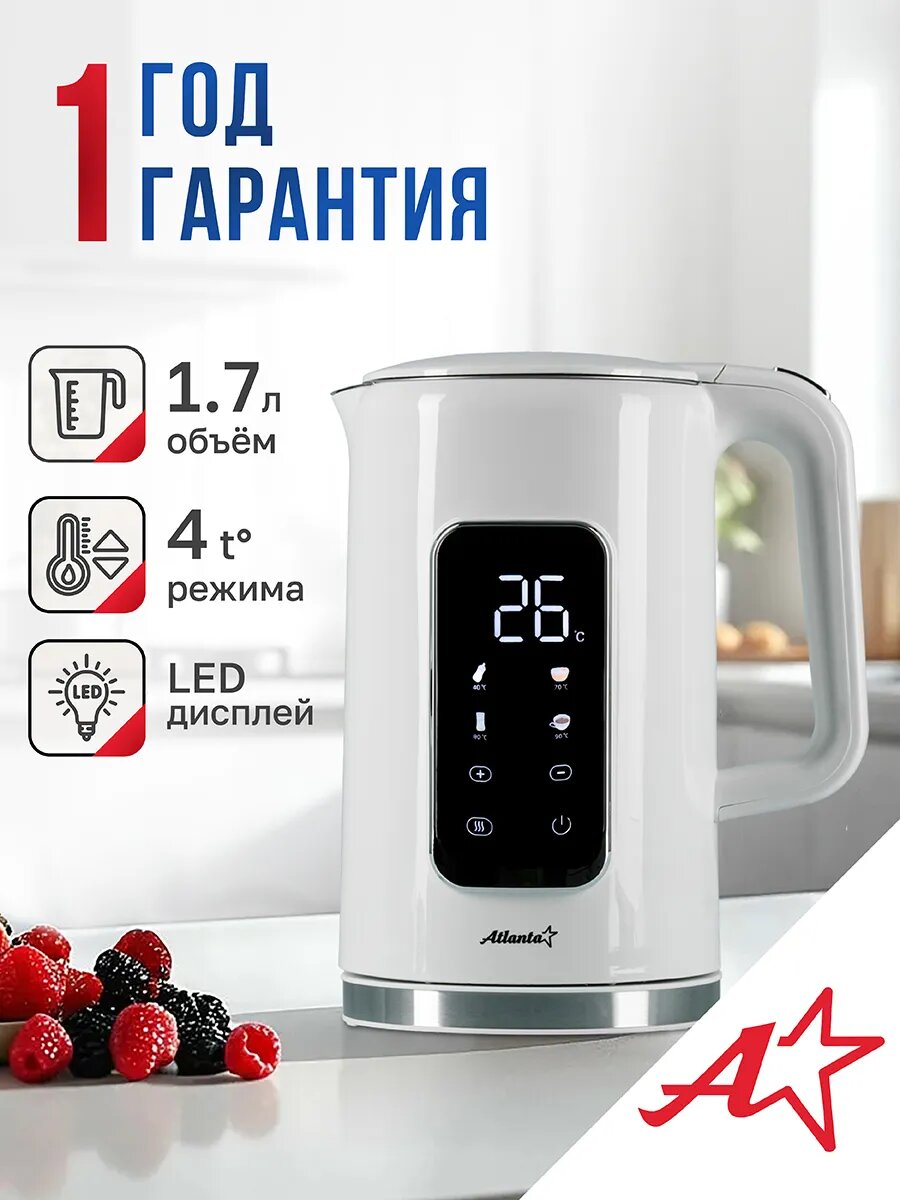 Чайник Atlanta ATH-2539, двойные стенки, 4 температурных режима, белый: сравнение цен, характеристики, фото, актуальное наличие и цены.