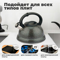Чайник со свистком, 2,7л. Модель выполнена по специальной пресс-форме с толщиной боковых стенок 0,4мм. Трехслойное дно, выполненное по технологии капсулирования, не деформируется и служит для равномерного распределения тепла. Ненагревающаяся нейлоновая ручка с кнопкой для открывания носика. Безопасный и громкий свисток вовремя проинформирует, что вода закипела. Высокопрочное покрытие чайника сохраняет отличный внешний вид изделия намного дольше. Подходит для всех типов нагревательных поверхностей. Материал нержавеющая сталь.