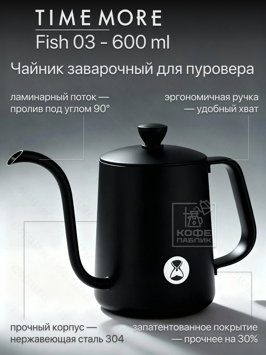 Чайник для кофе Timemore Fish 03, 600 мл, чёрный — с тонким носиком, нержавеющая сталь: сравнение цен, характеристики, фото, актуальное наличие и цены.