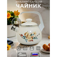 Объем: 2,5 литра. Материал: высококачественная сталь с эмалированным покрытием, обеспечивающим долговечность и защиту от коррозии. Крышка: плотно прилегающая металлическая крышка с удобной ручкой. Ручка: фиксированная пластиковая ручка, обеспечивающая комфорт и безопасность при использовании. Свисток: носик оснащен свистком, сигнализирующим о закипании воды. Совместимость с плитами: подходит для всех типов варочных поверхностей, включая газовые, электрические, стеклокерамические и индукционные плиты. Уход: эмалированное покрытие облегчает очистку; изделие можно мыть в посудомоечной машине.