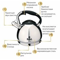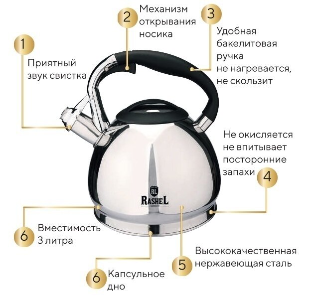 Чайник из нержавеющей стали со свистком Rashel 3 л для газовой, электрической, индукционной плиты: сравнение цен, характеристики, фото, актуальное наличие и цены.