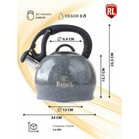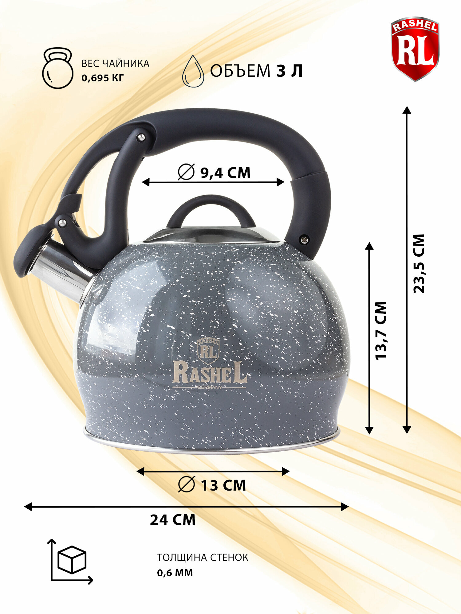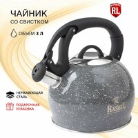 Чайник для кипячения воды Рашел со свистком объемом 3 л выполнен из высококачественной нержавеющей стали 18/10(AISI 304), изделие поставляется в подарочной упаковке. Нужна безопасная, качественная и красивая посуда для кухни? Благодаря свойствам материала посуда устойчива к коррозии, не вызывает аллергии, не вступает во взаимодействие с жидкостью, не искажает вкус и запах, благодаря чему вы всегда получите натуральный, насыщенный вкус и аромат напитков. Идеально гладкая поверхность легко очищается от загрязнений, исключает размножение бактерий! Удобная фурнитура из термостойкого материала позволяет безопасно пользоваться чайником.