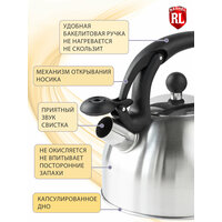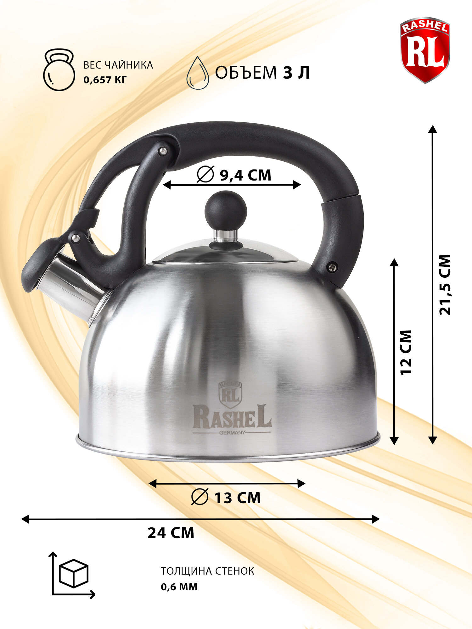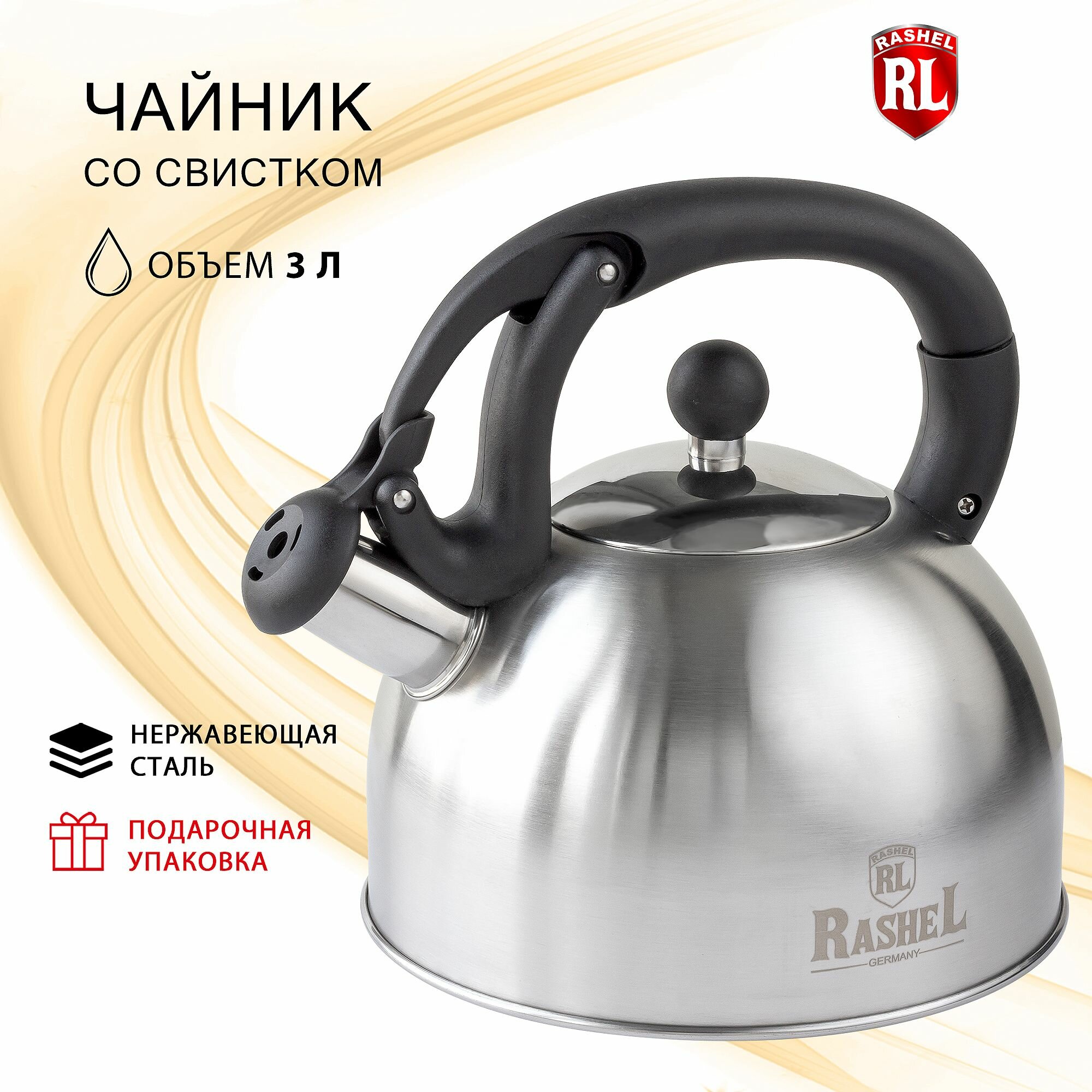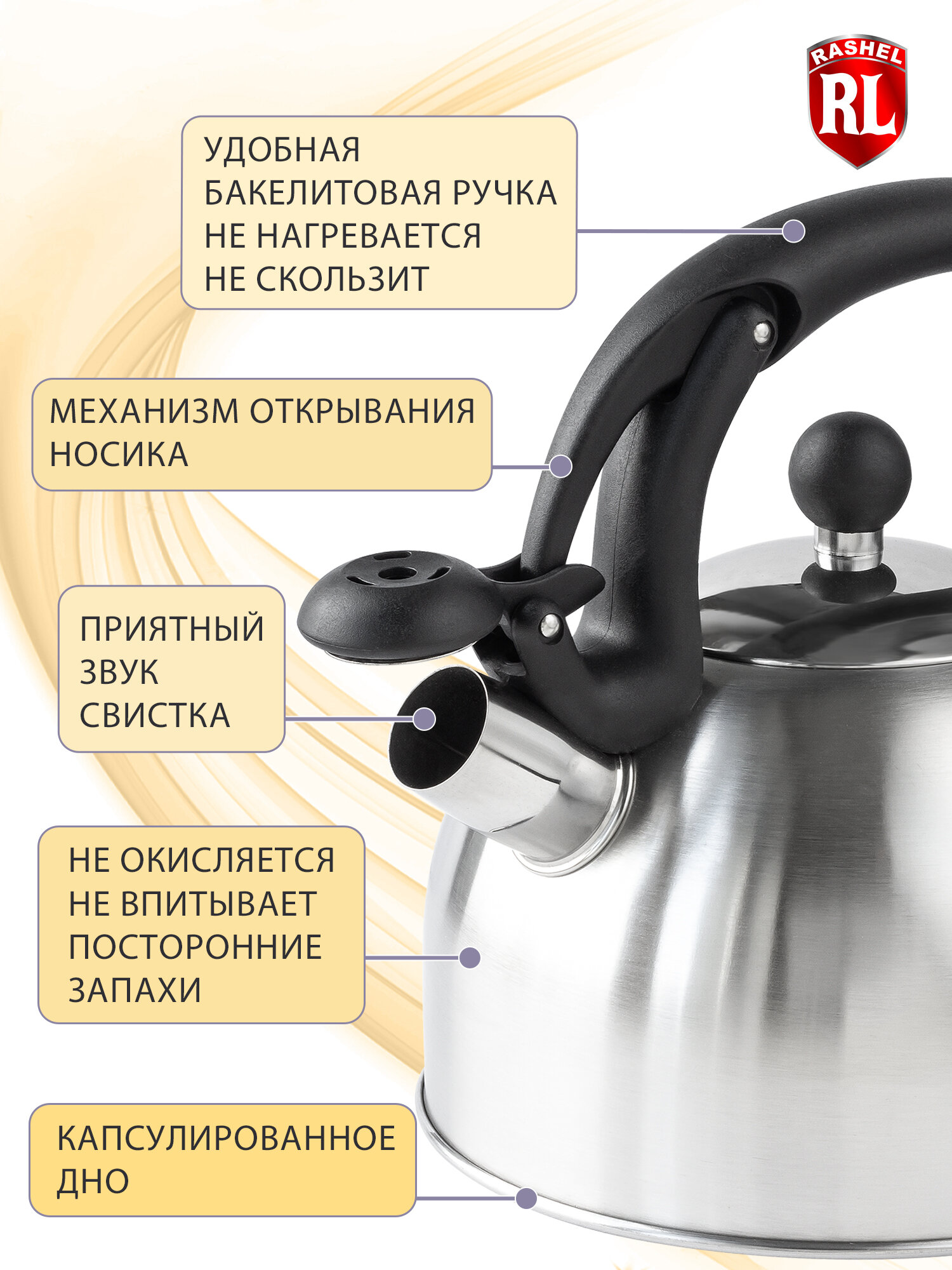 Чайник из нержавеющей стали со свистком Rashel 3 л для газовой, электрической, индукционной плиты. Чайник из нержавеющей стали со свистком Rashel 3 л для газовой, электрической, индукционной плиты. Чайник из нержавеющей стали Rashel 3 л со свистком для индукционной плиты. Чайник изготовлен из высококачественной нержавеющей стали. Нержавеющая сталь обладает высокой устойчивостью к коррозии, не окисляется и не впитывает посторонние запахи. Капсулированное дно с алюминиевой прослойкой способствует высокой теплопроводимости и равномерному распределению тепла. Чайник со свистком из нержавеющей стали 3 литра - идеальное решение для вас. Чайник для плиты имеет бакелитовую ручку с прорезиненным покрытием с рычагом для открывания носика. Эргономичная комбинированная фиксированная ручка с покрытием "soft-touch". Чайник для плиты газовой имеет удобный курковый механизм.