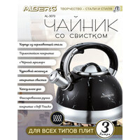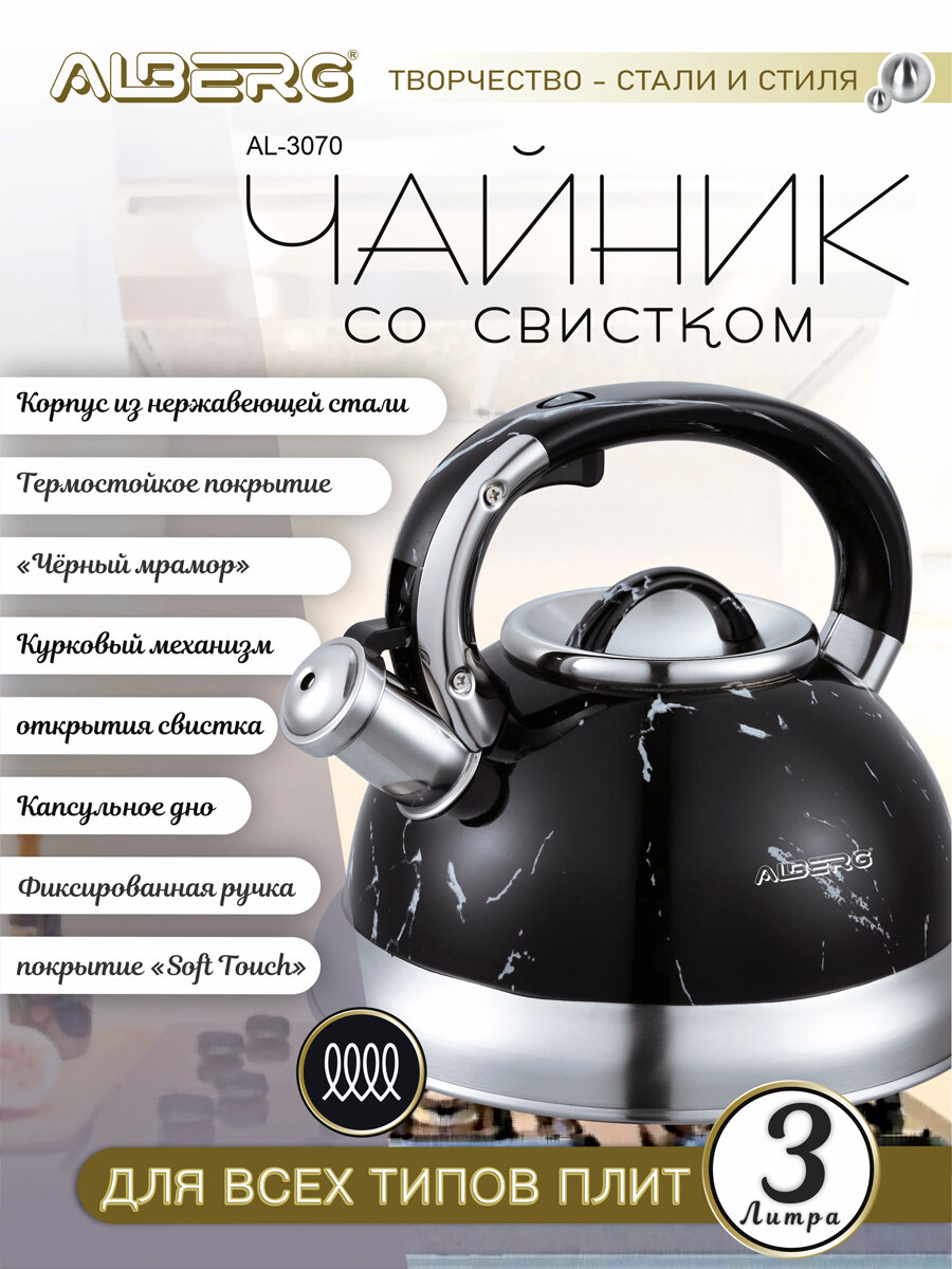 Чайник для плиты со свистком ALBERG AL-3070 3 литра, свисток, из нержавеющей стали 0.5мм, внешнее термостойкое покрытие «Черный мрамор», индукция: сравнение цен, характеристики, фото, актуальное наличие и цены.