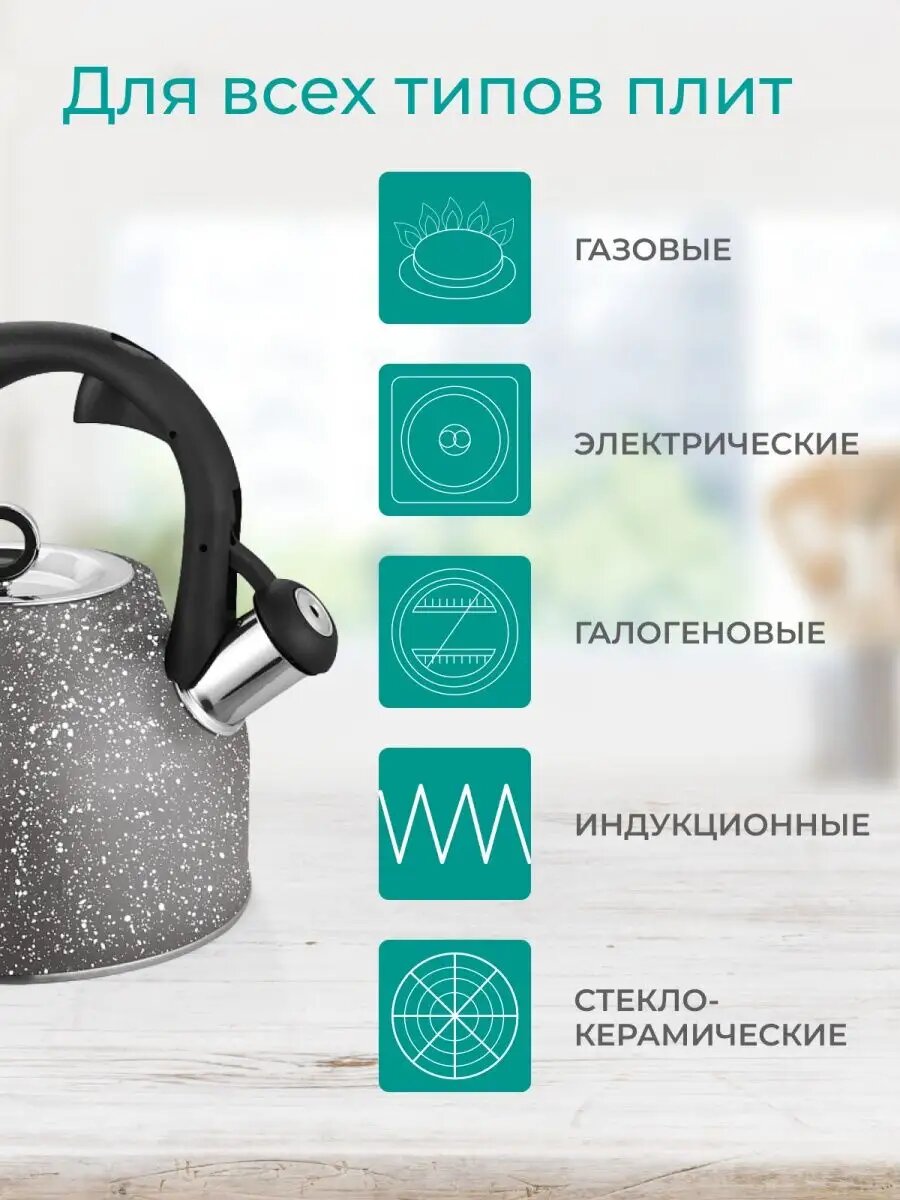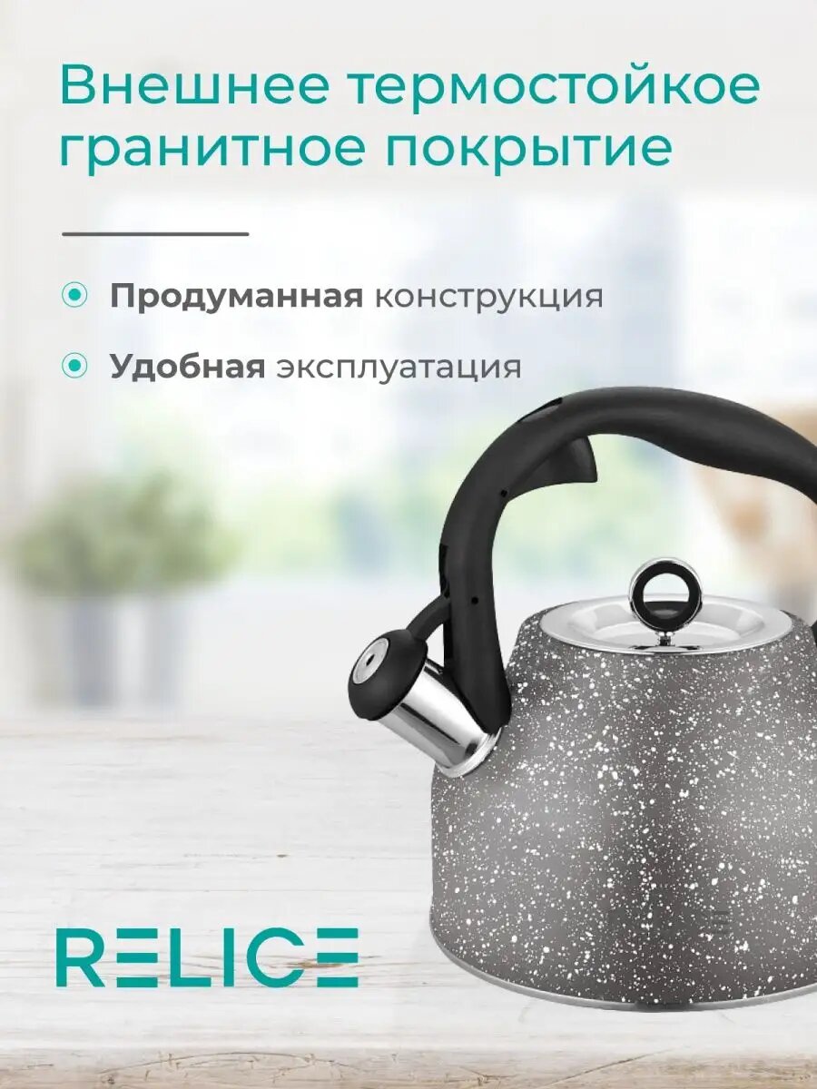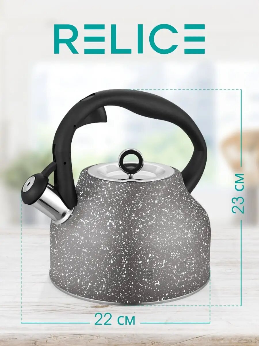 Чайник для плиты из нержавеющей стали бренда RELICE в классическом корпусе со свистком и элегантной ручкой станет отличным помощником на вашей кухне. Современный стильный дизайн прекрасно впишется в любой интерьер. Сочетается с современной кухонной посудой. После закипания воды чайник подаст сигнал, который вы не пропустите. Удобная широкая горловина для налива воды. Корпус чайника выполнен из экологичной высококачественной нержавеющей стали, которая не окисляется. Чайник не выделяет вредных веществ, обладает высокой износостойкостью. Фиксированная термостойкая ручка не нагревается во время кипения и не скользит. Чайник металлический нержавейка на 2,5 литра подходит для электрической, газовой, керамической, индукционной плиты. Свисток на носике легко и безопасно открывается с помощью специальной кнопки на ручке. Чайник не требует отдельного места, его можно оставлять прямо на плите. При правильном уходе чайник железный для плиты прослужит долгое время и будет радовать вас любимыми горячими напитками. Чайник для кухни станет прекрасным подарком маме, бабушке, подруге на Новый год, 8 Марта, День рождения и любой другой праздник. Мечта хозяйки!