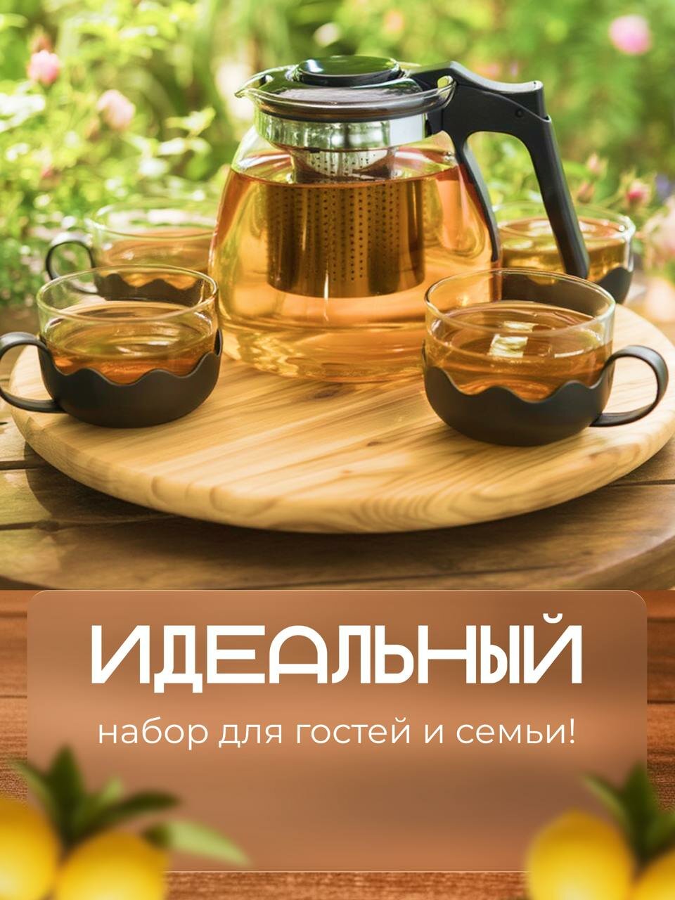 Набор чайный состоит из четырёх кружек 150 мл и заварочного стеклянного чайника с металлическим ситом объёмом 950 мл. Подходит для заваривания всех сортов чая и травяных смесей. Легко моется, не впитывает посторонние запахи. Отлично впишется в дизайн любой кухни. Рекомендуется мыть вручную с применением мягких моющих средств. Не использовать для ухода абразивные чистящие средства и жёсткие губки. Можно мыть в посудомоечной машине на щадящем режиме. Можно использовать в СВЧ-печи: да. Можно мыть в посудомоечной машине: да. Текстура: Гладкая. Выпить кружечку горячего свежезаваренного чая - самое приятное в течении дня. А полностью насладиться процессом чаепития поможет стеклянный чайный сервиз с заварочным чайником и чашками на 4 персоны. Благодаря термостойкому стеклу, из которого сделан сервиз, Вы будете наслаждаться самым горячим чаем! Изделия содержат пластиковую фурнитуру черного цвета, что обеспечит прекрасное сочетание с интерьером Вашей кухни!