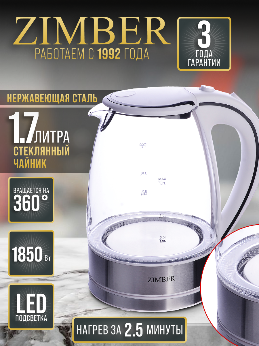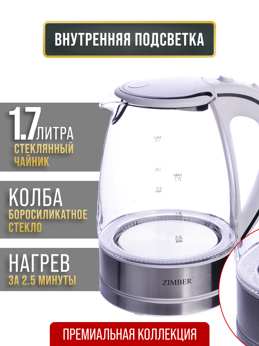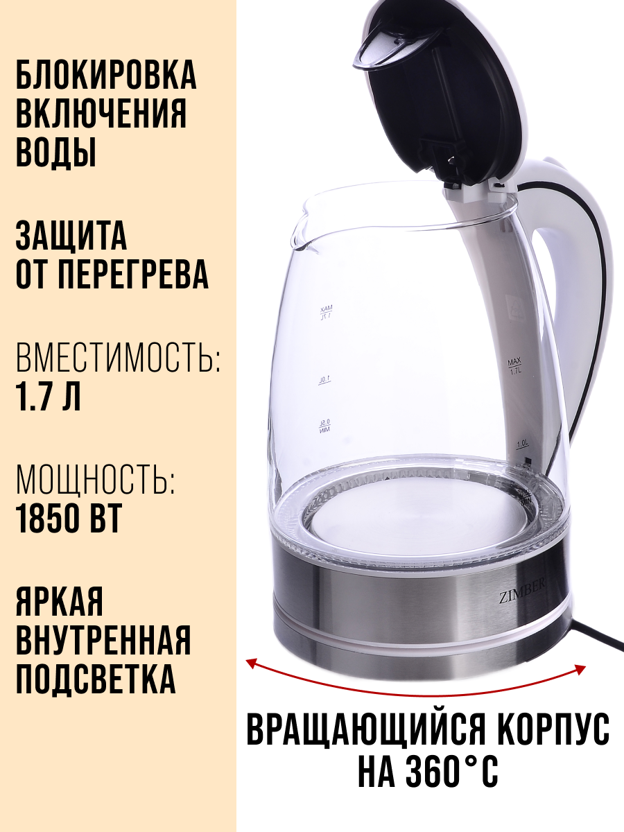 Чайник электрический ZIMBER , 1,7 л, с подсветкой, стекло, пластик, 2200 Вт: сравнение цен, характеристики, фото, актуальное наличие и цены.