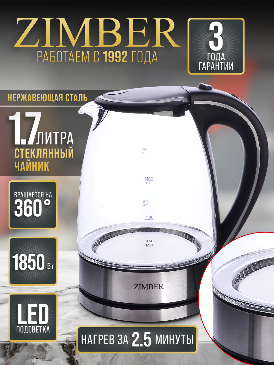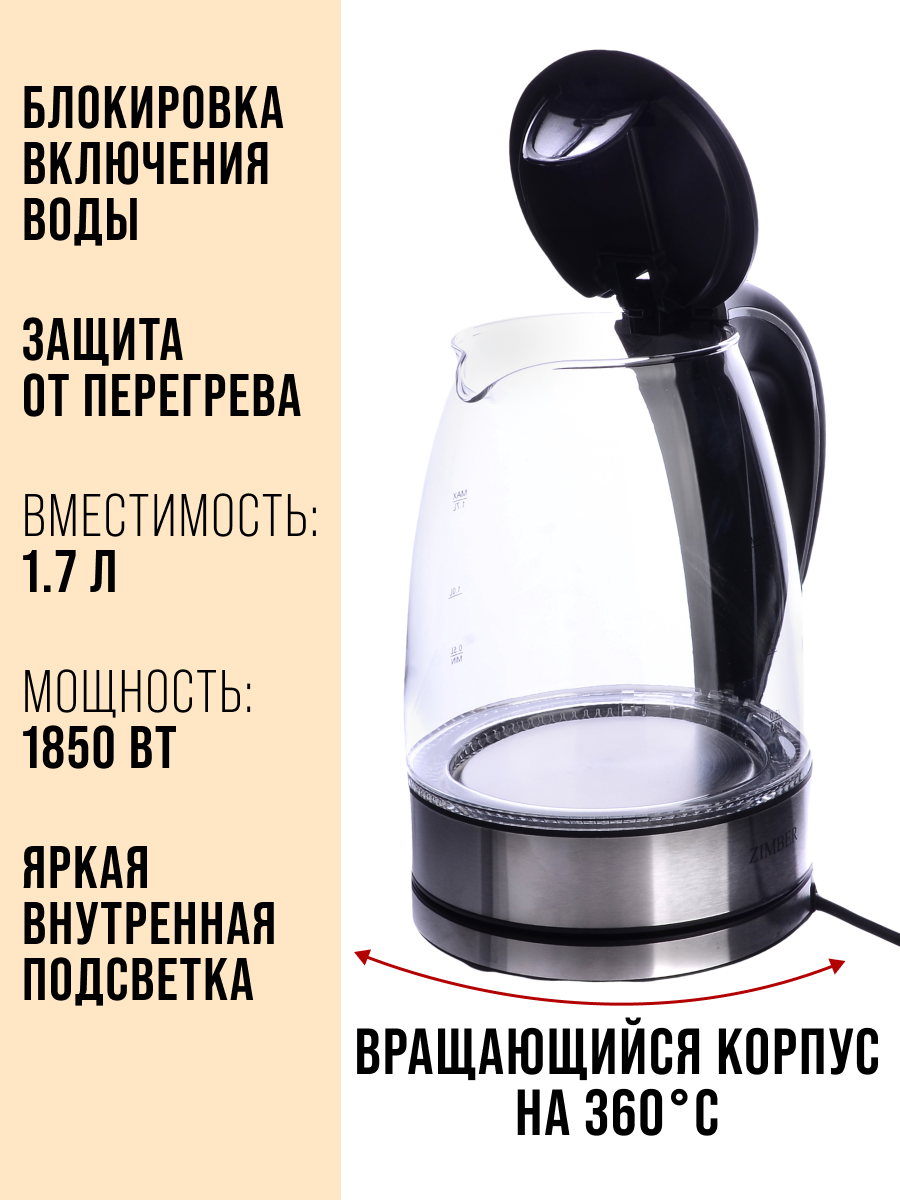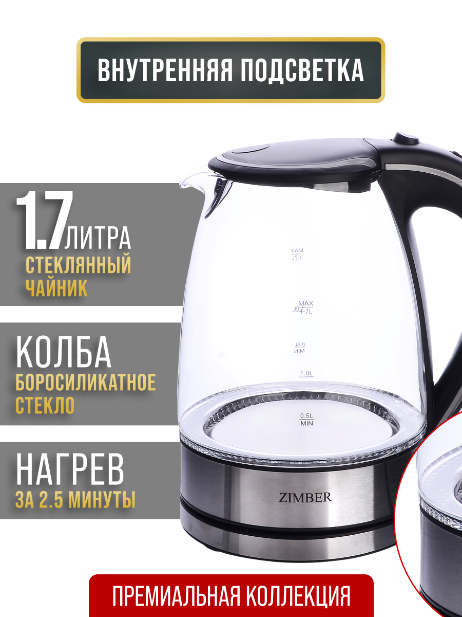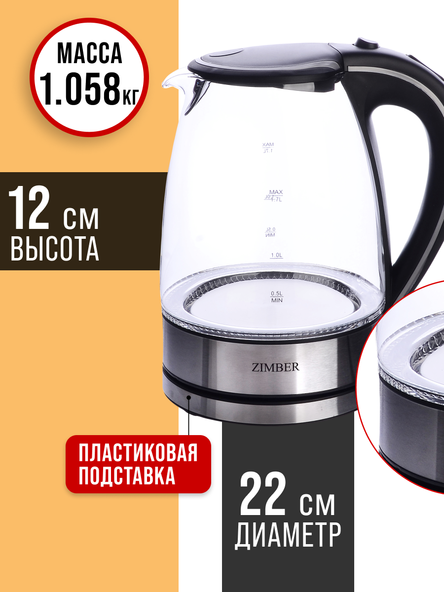 Электрический чайник ZIMBER, с подсветкой, 2200W, 1,7л, стекло: сравнение цен, характеристики, фото, актуальное наличие и цены.