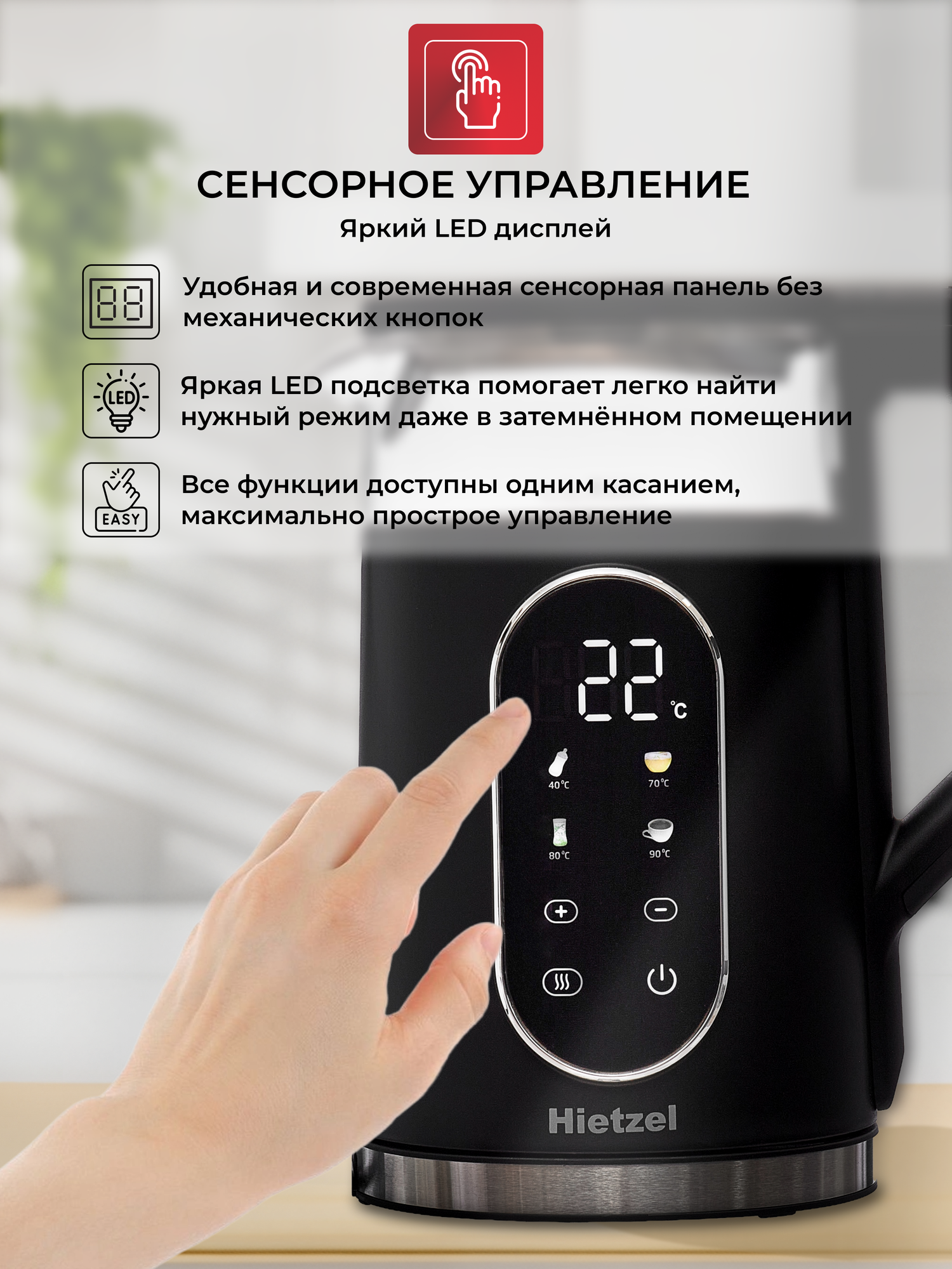 | Особенности | вращение на 360 градусов, двойные стенки, дисплей, индикатор уровня воды, индикация включения, отсек для хранения шнура, сенсорное управление, терморисунок |