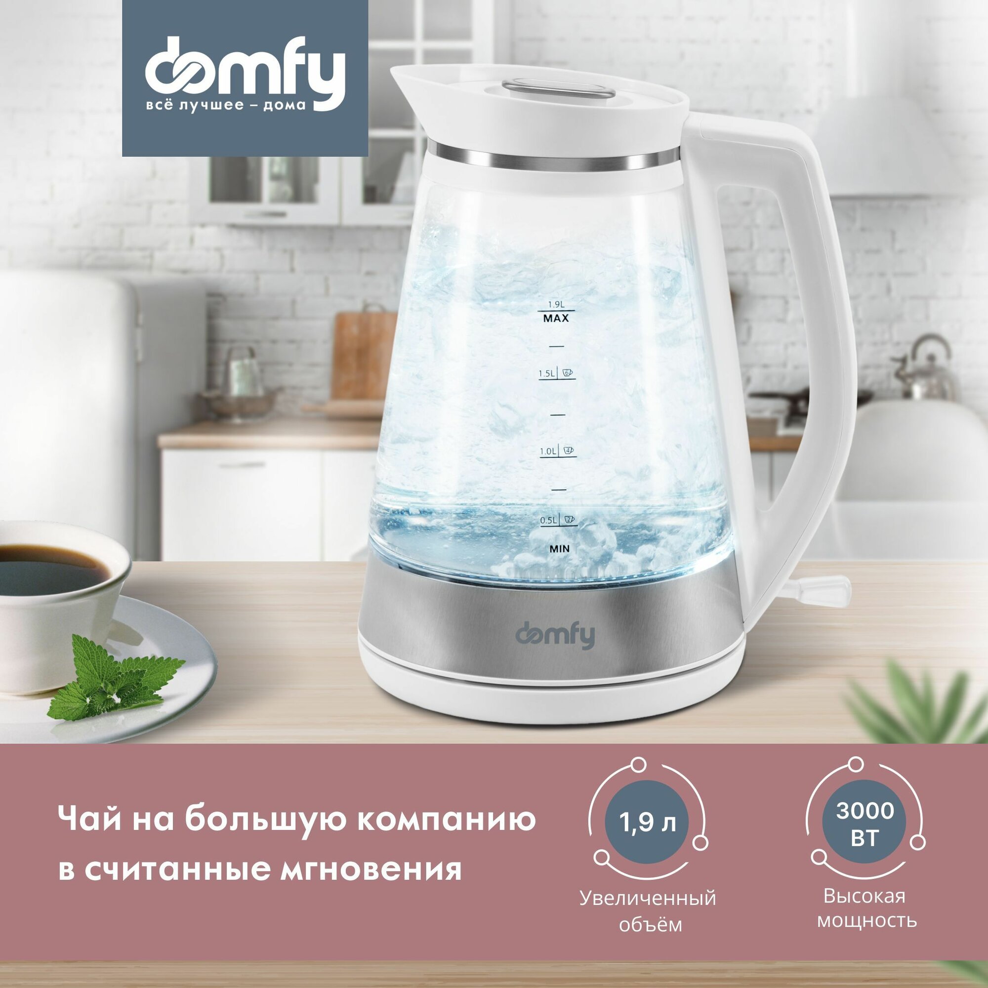Чайник электрический Domfy DSW-EK505. Высокая мощность 3000Вт. Увеличенный объем 1.8л. Высокая скорость закипания. белый/прозрачный (стекло): сравнение цен, характеристики, фото, актуальное наличие и цены.