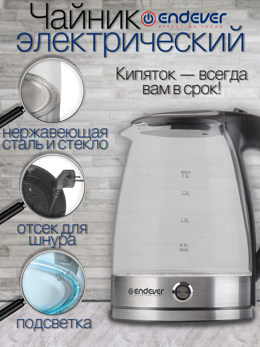 Купить Чайник электрический стеклянный Endever KR-345G / 1,8л / 2200 Вт/ с подсветкой с доставкой по всей России.