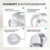 вращение на 360 градусов, двойные стенки, индикатор уровня воды, индикация включения, отсек для хранения шнура, съемная крышка, фильтр