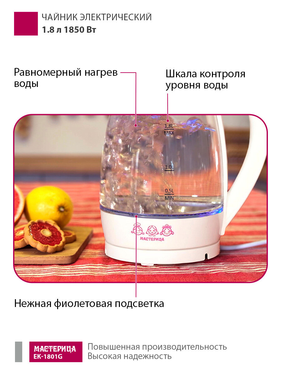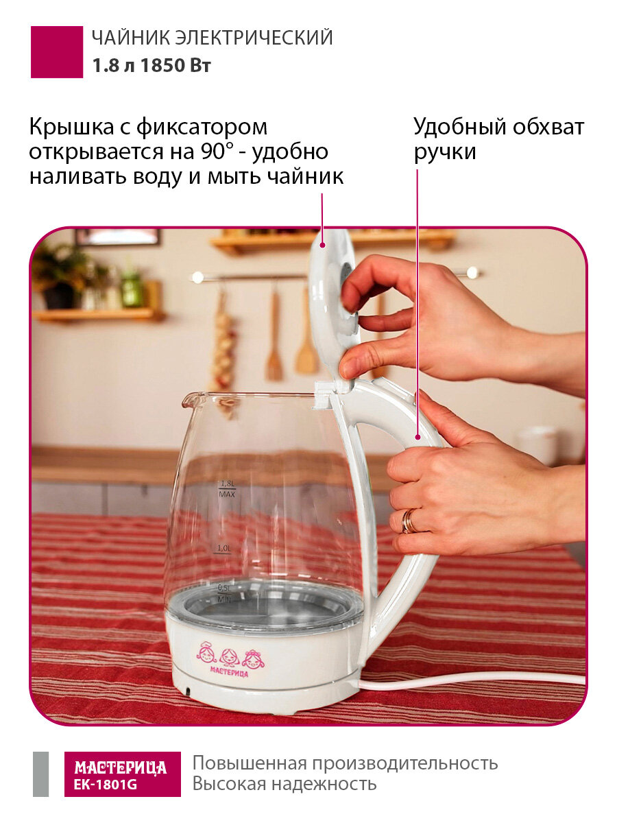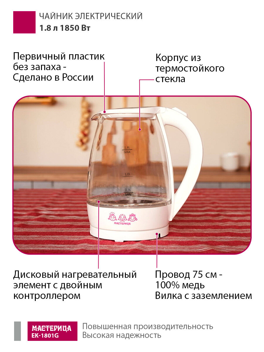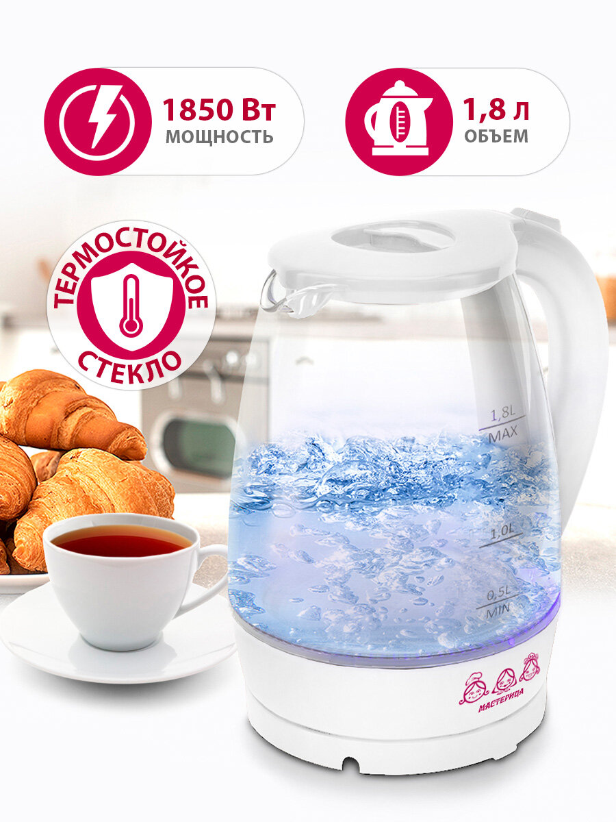 Чайник электрический Мастерица ЕК-1801G, снег, 1,8л, стекло, 1850 Вт: сравнение цен, характеристики, фото, актуальное наличие и цены.