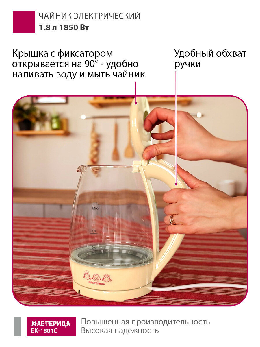 | Безопасность | блокировка включения без воды, блокировка крышки, отключение при снятии с подставки |