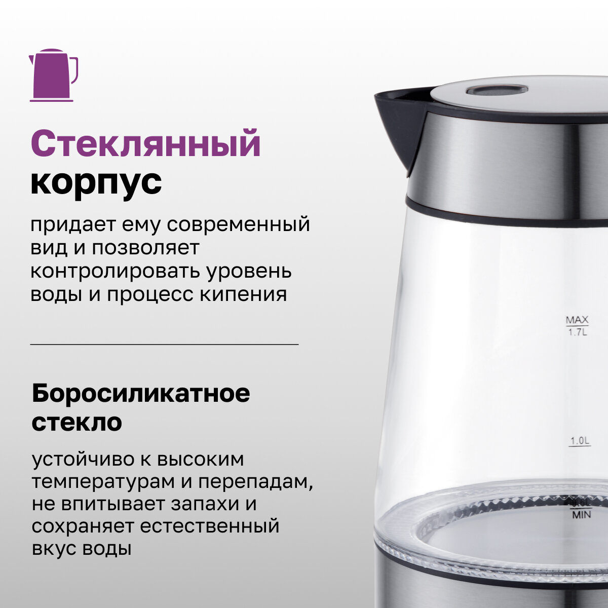 - Автоматическое отключение: чайник автоматически выключается после закипания воды, что гарантирует безопасность и экономию электроэнергии.