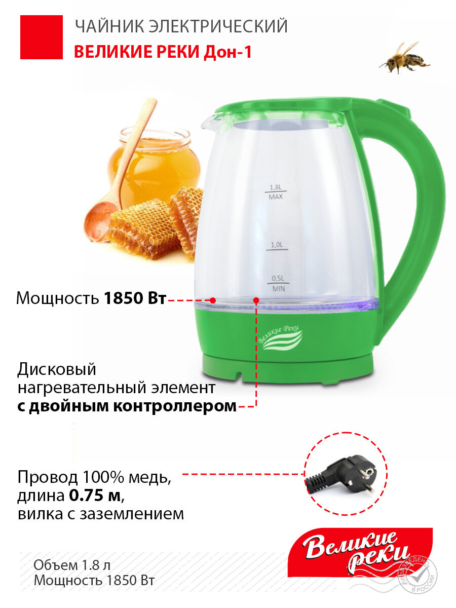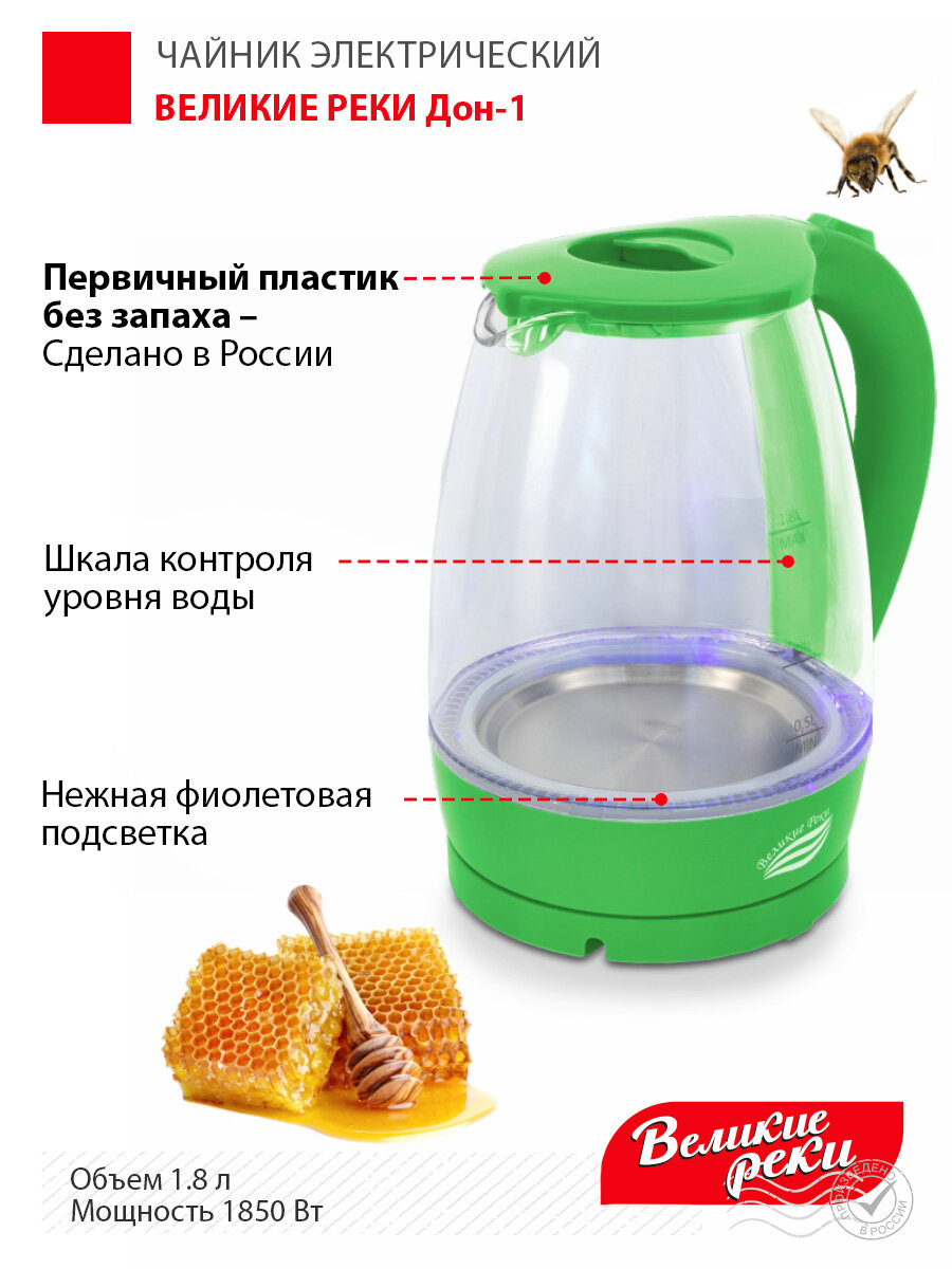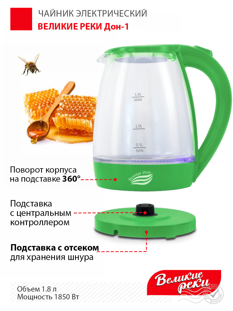 Купить Чайник электрический Великие Реки Дон-1 салатовый, 1,8 л, стекло, 1850 Вт с доставкой по всей России. Чайник электрический Великие Реки Дон-1 салатовый, 1,8 л, стекло, 1850 Вт: сравнение цен, характеристики, фото, актуальное наличие и цены.