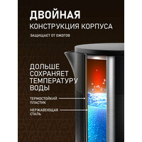 | Особенности | вращение на 360 градусов, двойные стенки, дисплей, заварочный чайник, индикатор уровня воды, индикация включения, отсек для хранения шнура, сенсорное управление |
