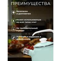 Объем: 2,5 литра. Материал: высококачественная сталь с эмалированным покрытием, обеспечивающим долговечность и защиту от коррозии. Крышка: плотно прилегающая металлическая крышка с удобной ручкой. Ручка: фиксированная пластиковая ручка, обеспечивающая комфорт и безопасность при использовании. Свисток: носик оснащен свистком, сигнализирующим о закипании воды. Совместимость с плитами: подходит для всех типов варочных поверхностей, включая газовые, электрические, стеклокерамические и индукционные плиты. Уход: эмалированное покрытие облегчает очистку; изделие можно мыть в посудомоечной машине.