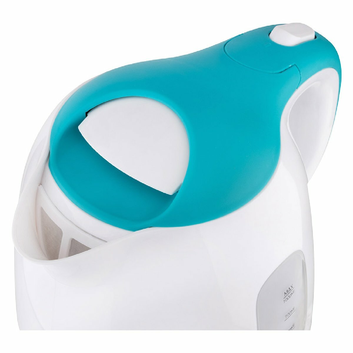 | Дополнительная информация | объем 1 л, корпус из высококачественного пластика, шкала уровня воды, закрытый нагревательный элемент из нержавеющей стали, поворот на подставке 360°, защита от работы без воды, автоматический выключатель, световой индикатор работы, место для хранения шнура, мощность 900-1100 вт, цвет бело-бирюзовый, длина шнура 71 см. |