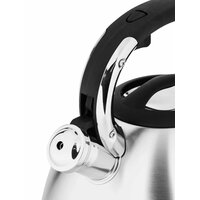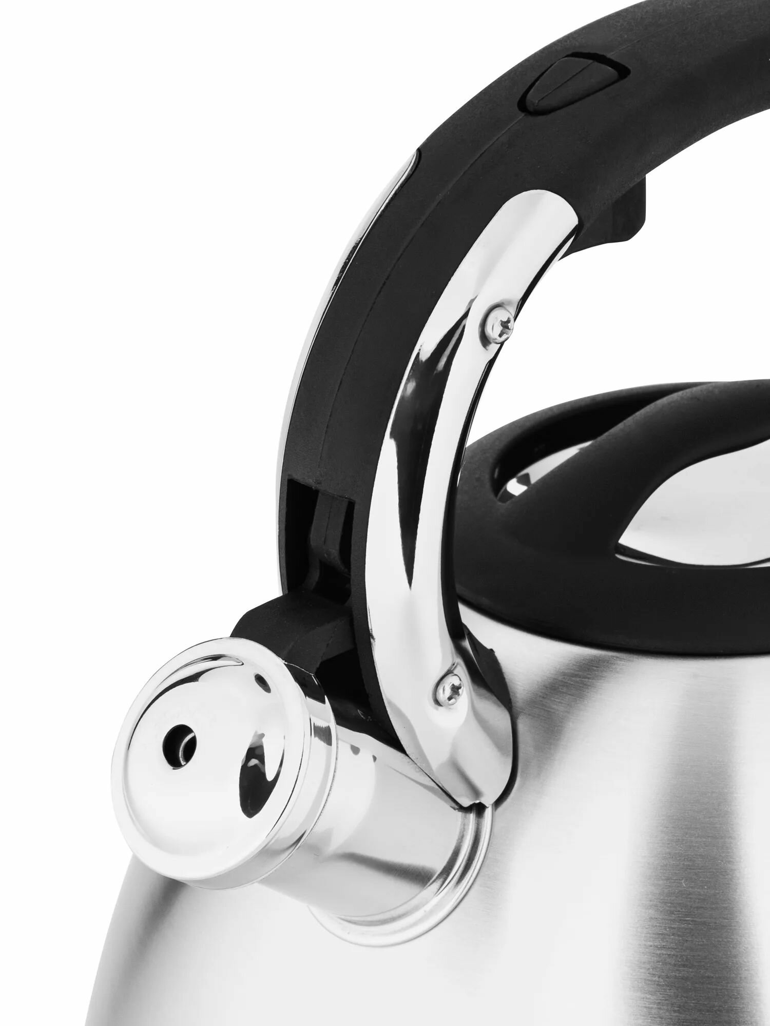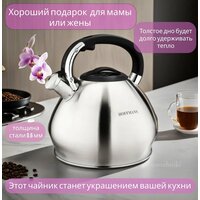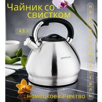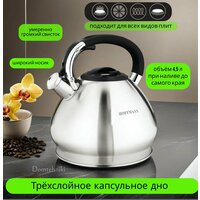 Чайник со свистком из высококачественной нержавеющей стали толщиной 0,6мм и 3-х капсульным антипригарным дном матовой/зеркальной полировки. Подходит для газовой, электрической, керамической и индукционной плиты. Эргономичная бакелитовая ручка позволяет брать чайник, не рискуя обжечься. Эргономичная форма обеспечивает максимальный комфорт при подъеме и переливании Съемная большая крышка делает чистку чайника простой и удобной. Громкий свисток оповестит вас о закипании, позволяя сосредоточиться на других проблемах, как уборка дома, приготовление блюд, детские игры с ребенком. Можно чистить в посудомоечной машине. Термоаккумулирующее капсулированное дно обеспечивает равномерную максимальную теплопроводность для повышения быстроты закипания. Благодаря эстетичному дизайну впишется в любой интерьер на кухне, легко сочетается с остальной посудой в доме или на даче.