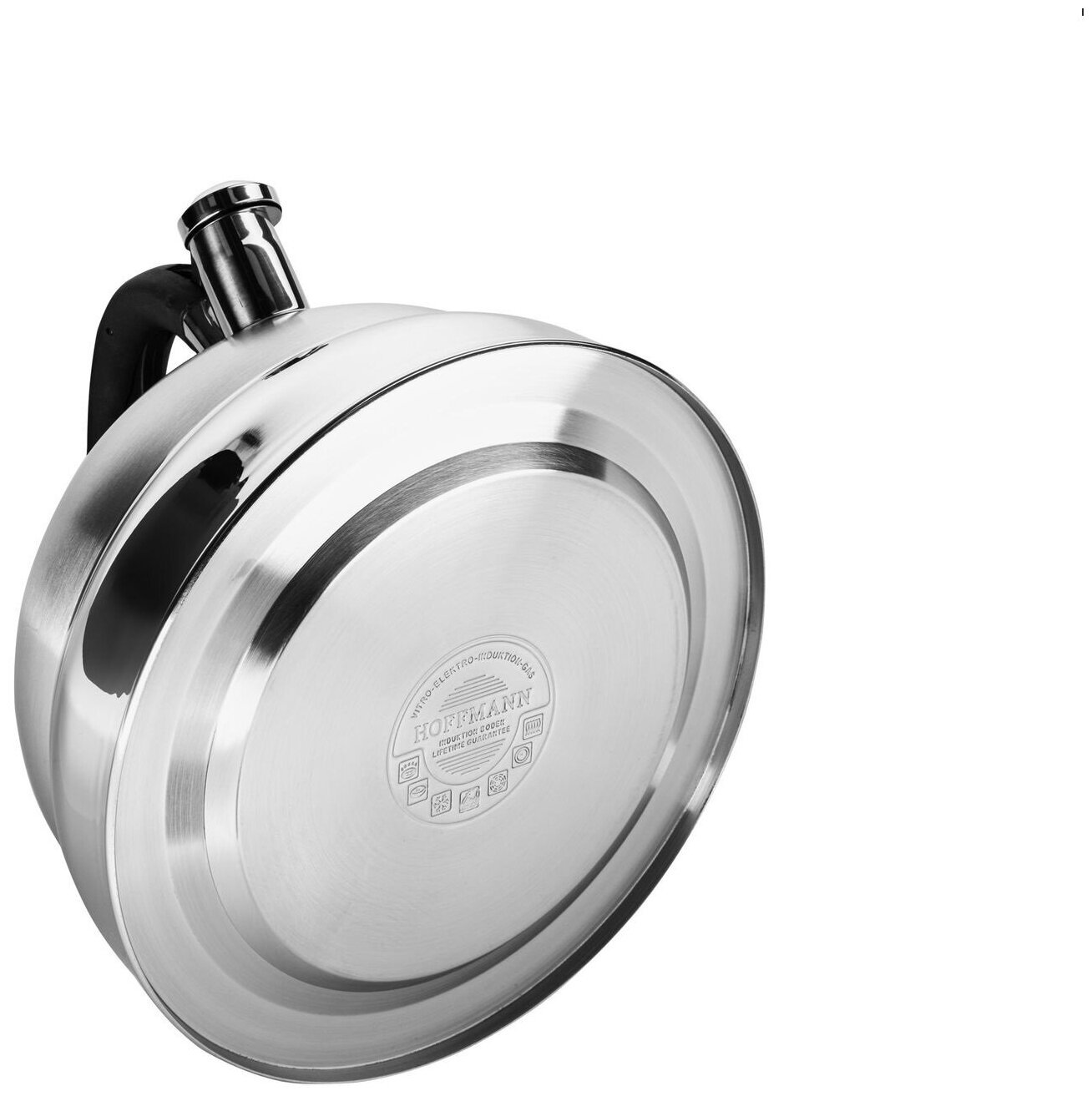 Чайник со свистком из высококачественной нержавеющей стали толщиной 0,6 мм и 3-х капсульным антипригарным дном матовой/зеркальной полировки. Подходит для газовой, электрической, керамической и индукционной плиты.