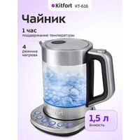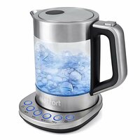 Корпус чайника Kitfort КТ-616 выполнен из стекла, а крышка и подставка из сочетания пластмассы и нержавеющей стали. Мерная шкала нанесена на прозрачную часть корпуса. Большое горлышко чайника облегчает доступ внутрь при его мойке и во время удаления накипи. Ручка чайника пластиковая, не нагревается и удобно лежит в руке. Кнопка открывания крышки расположена сверху на ручке. При включении чайника загорается синяя подсветка, которая является индикатором работы и художественно подсвечивает кипящую воду. Нагревательный элемент (ТЭН) у этой модели чайника скрытый и находится в дне. Сверху он закрыт специальной металлической пластиной из нержавеющей стали, благодаря которой исключается прямой контакт ТЭНа с водой. Такая конструкция препятствует образованию накипи, облегчает уход и значительно снижает шум при нагревании воды. Подставка с центральным контактом дает возможность ставить чайник на нее в любом положении, обеспечивая вращение на 360. Снизу имеется отсек для хранения шнура, в который можно смотать излишки шнура электропитания, чтобы он не мешался на столе. На подставке расположены кнопки для включения и выключения чайника, установки режимов работы и выбора температуры. Все кнопки со световой индикацией, позволяющей легко определить, какой режим сейчас активен. При закипании, изменении режимов работы, а также при установке и снятии чайника с подставки прозвучит сигнал. Чайник автоматически отключается при закипании и при снятии его с подставки, имеет защиту от перегрева и защиту от включения без воды. Электрический чайник с терморегулятором Kitfort КТ-616 может не только вскипятить воду, но и нагреть ее до температуры 40, 70 и 90С, что очень удобно при заваривании различных сортов чая. Температура 40 С пригодится для приготовления детского питания. Чайник также оснащен функцией поддержания температуры. Температура воды контролируется встроенным в дно чайника термодатчиком.