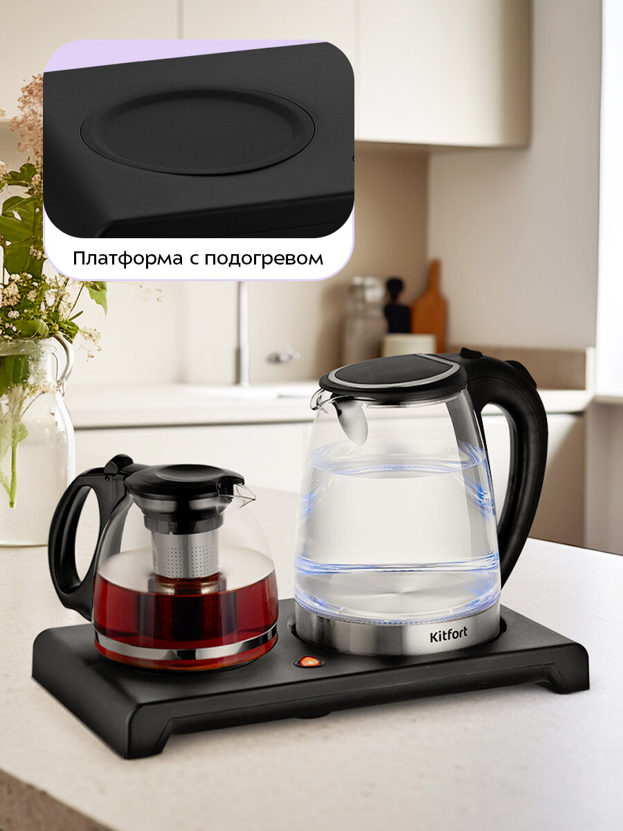 В комплекте с чайником идет удобная и практичная подставка, которая позволяет разместить устройство на любой поверхности.