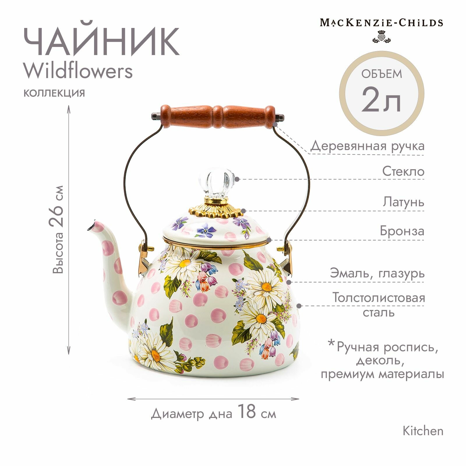Наш чайник Wildflowers, наполненный стилем MacKenzie-Childs, поможет вам найти новые причины поставить чайник на огонь. Днище из толстой стали украшено цветочными рисунками, нанесенными вручную на розовые пятна, окрашенные вручную, и обрамлен бронзовой нержавеющей сталью. Оснащен деревянной ручкой и крышкой с прозрачной стеклянной ручкой. Великолепно смотрится наполненным свежесрезанными цветами или зеленью.